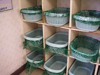 脱衣所の棚に置かれた籠に、緑色の網がかかっていました。