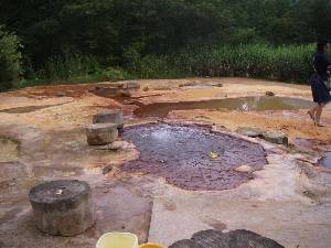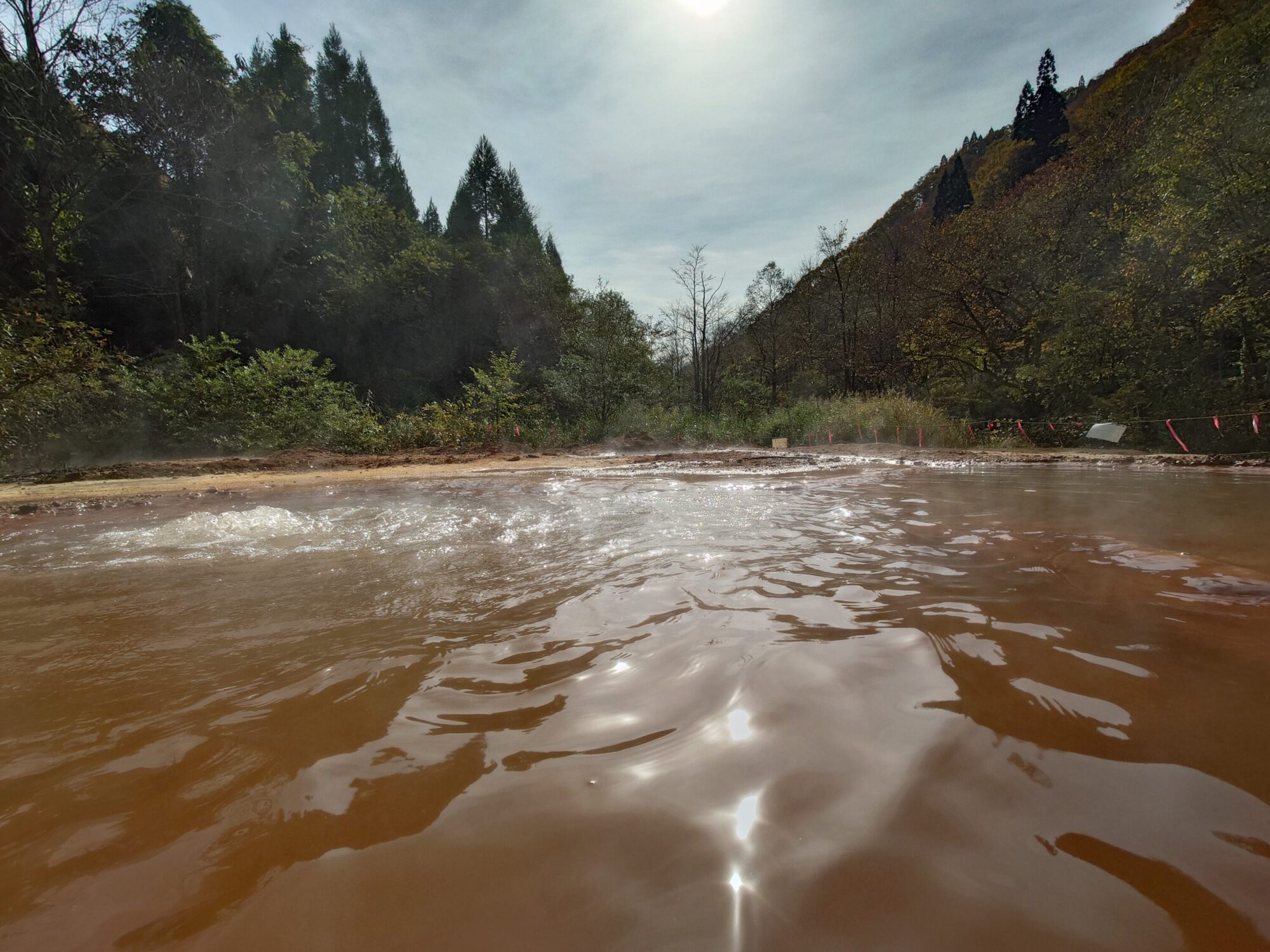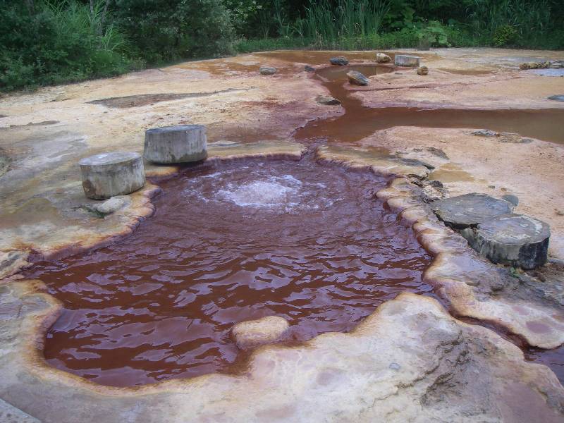 お湯は、ほんのり赤錆色に濁ったもので、写真で見て頂いても分かるとおり、地中から大量に自噴しています。湧出ポイントに腰を沈めると、自噴する気泡でお尻が浮き上がる程です。