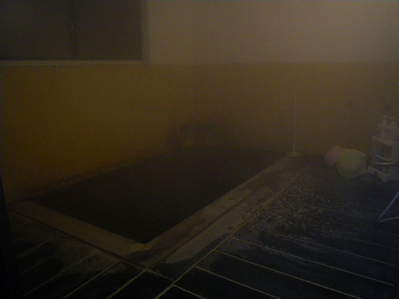 土気色に濁ったお湯は、共有源泉の組合3号源泉。湯口からは熱めのお湯がざぶざぶと注がれており、どうやらちゃんと掛け流しのようで、洗い場にオーバーフローしています。
