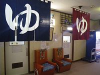 お風呂は長い廊下を歩いた先にあります。大きな「ゆ」の暖簾があり、色で男女別が分かるようになっています。