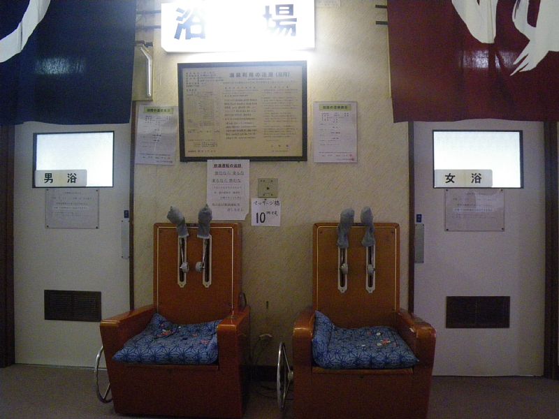 男女の浴場入り口に、年季の入ったマッサージチェアが2つ並んでいました。