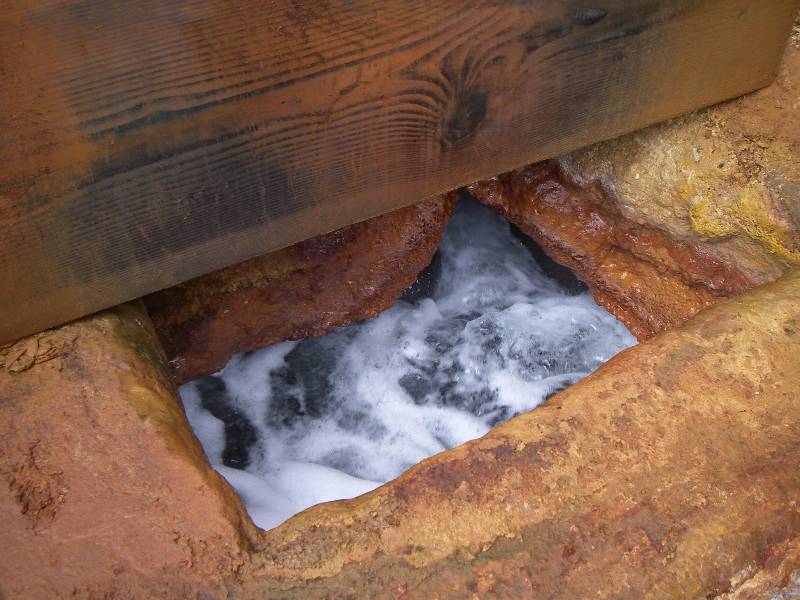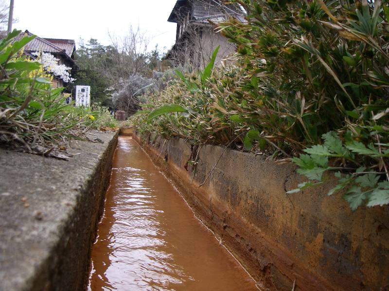 なんと、温泉の廃湯が垂れ流しで、成分が付着して茶褐色になっているのです。