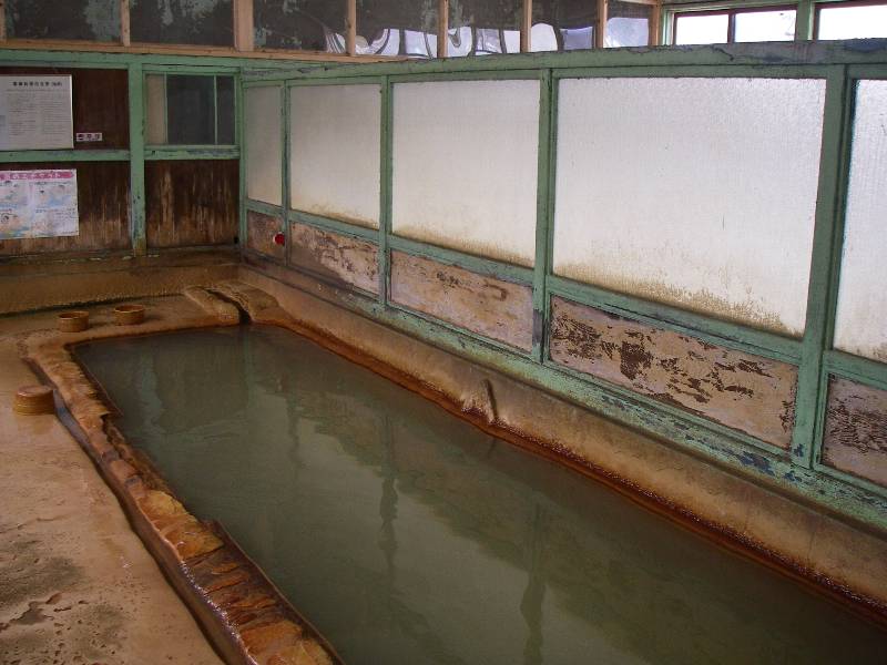 まずは内湯ですが、かなり鄙びた浴室でビックリです。脱衣所と浴室は一体になっており、脱衣スペースと縦長な湯船が並んだ形になっています。