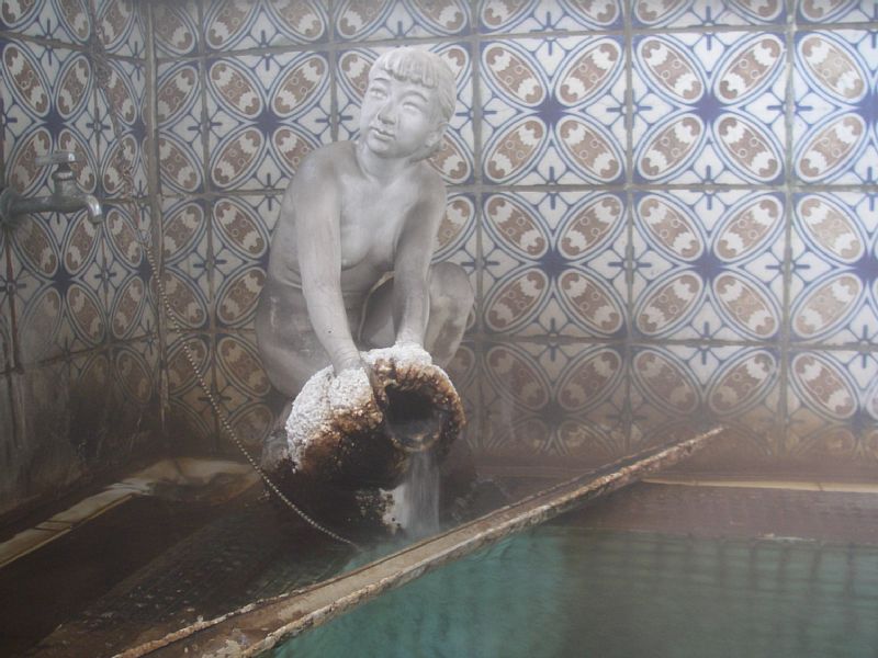 湯口からは熱いお湯が注がれていますが、そのお湯は鉄製の樋の上に流れ落ち、その大半が洗い場に捨てられてしまっています。