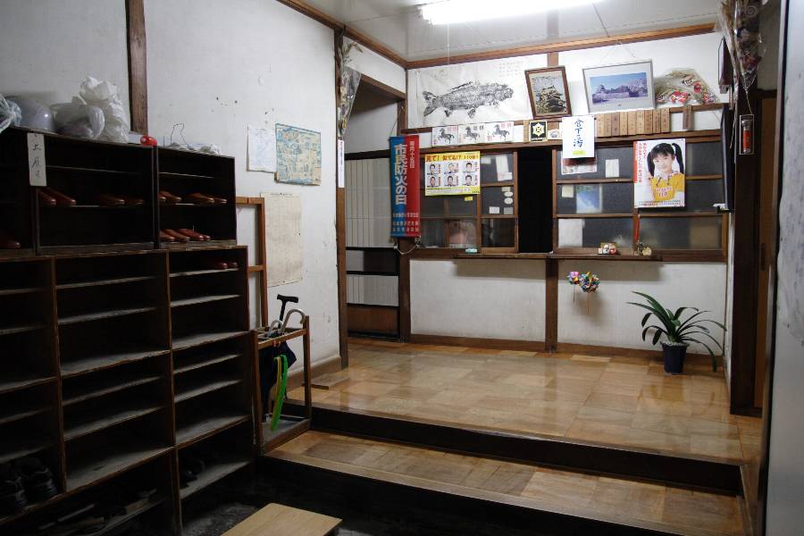 そんな訳で、館内は少し複雑。玄関で靴を脱ぎ、受付でお金を払い、建物の廊下を歩いて奥に入った所にお風呂場がありました。