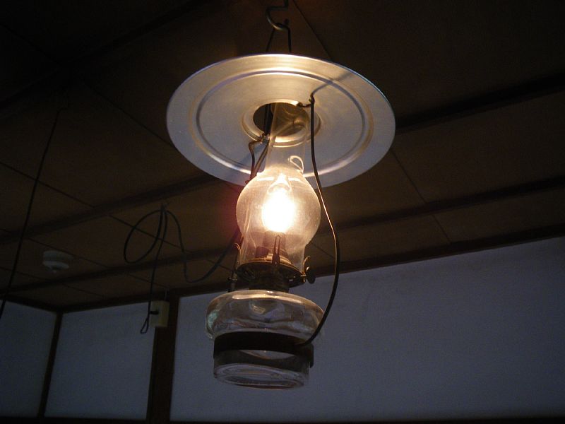 部屋の照明はランプだけ。2個あり、ひとつは電気、もうひとつは灯油を使った本物のランプです。