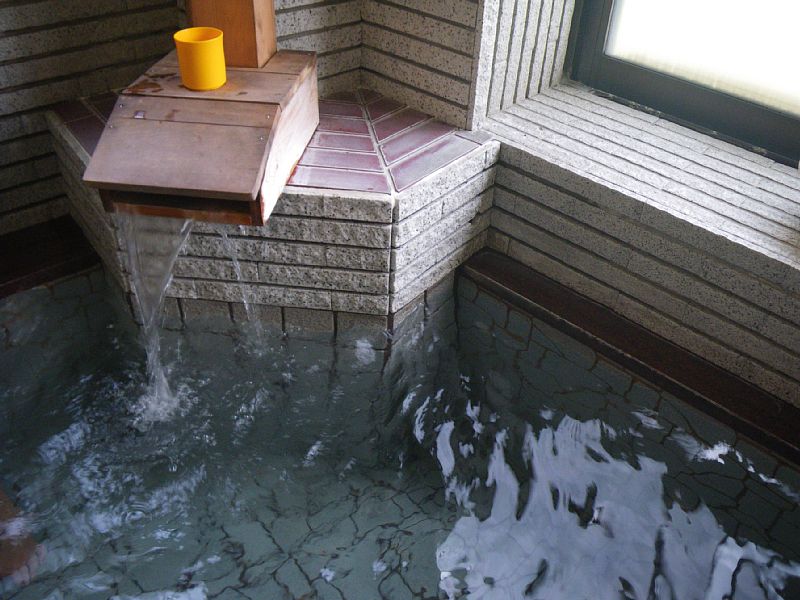 肝心のお湯ですが、ごく微量に濁って見える、透明なものです。タイルのせいで少し青く見えますが、無色です。