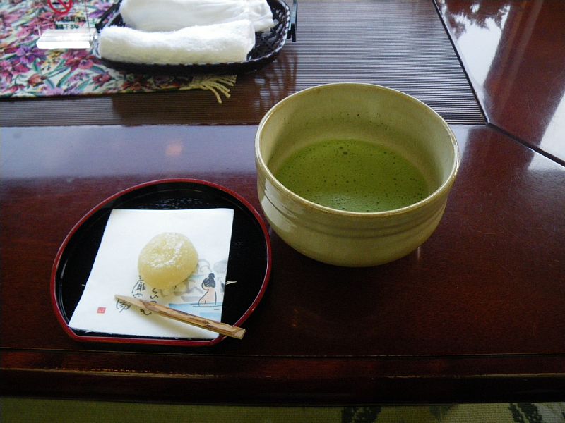 何とか追い出されずに中に入ると、ロビーに通され、「こちらにお掛け下さい」と、ソファを薦められました。何が始まるのだろうと待っていたら、なんと、抹茶とお茶菓子が出てくるではありませんか。