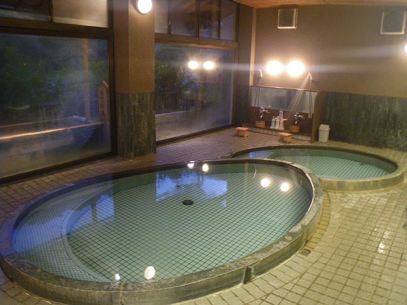まずは内湯。玉子がふたつ並んでいるような可愛らしい湯船が、浴室中央にあります。洗い場も数人分。お湯は無色透明で、無臭。塩素臭もしませんが、温泉臭もしません。どうやらちゃんと掛け流しになっているようです。