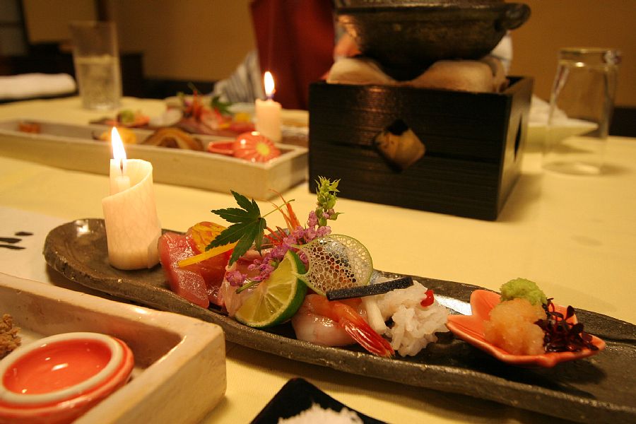 途中で演出の為と、電気を消すシーンも。一体何が出てくるかと思いきや、キャンドルつきのお刺身盛り合わせが出てきました。