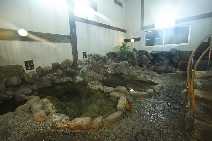 さて、落ち着いたところで、夕食前にお風呂。この時間帯は女湯が岩風呂で、男湯は露天つきの新しい浴室です。