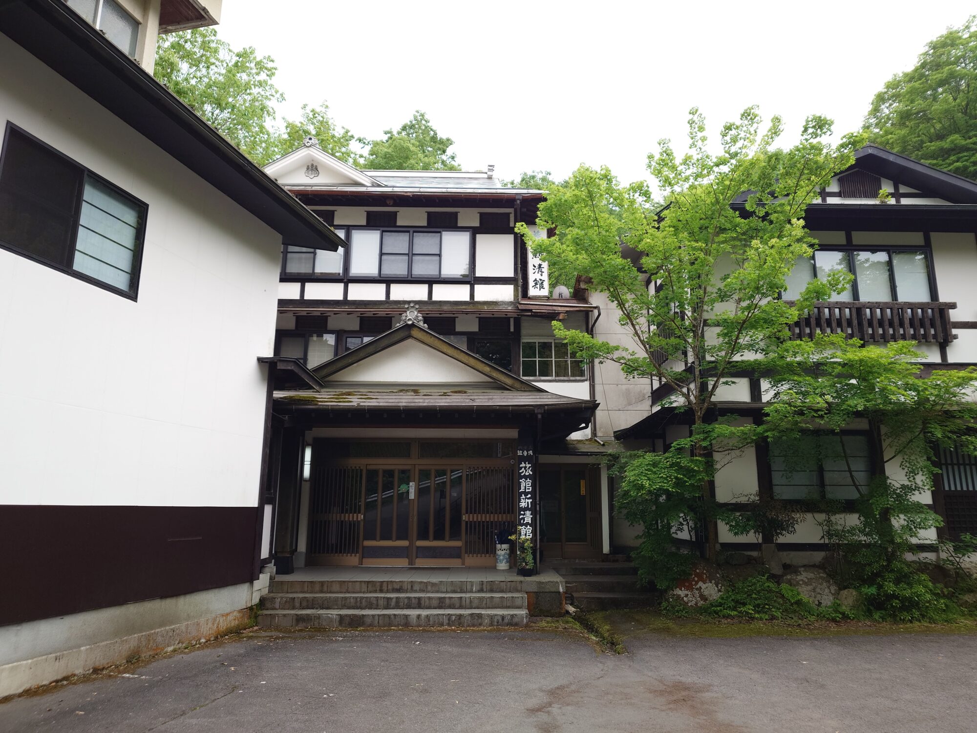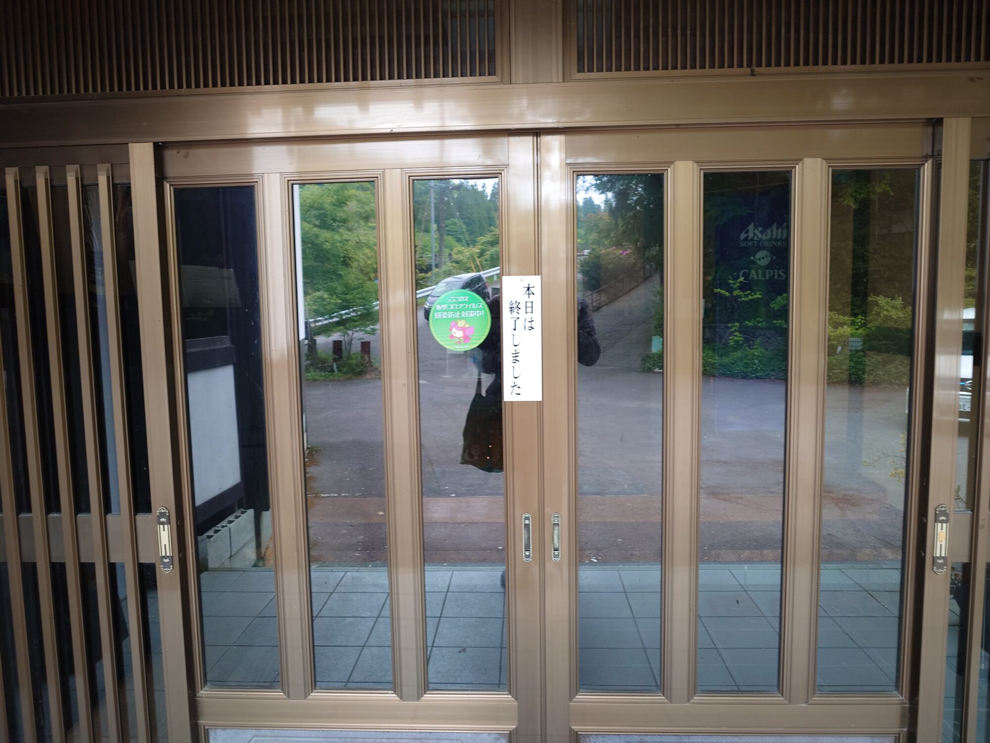 筌ノ口温泉の清新館に来てみたら玄関先に「本日は終了しました」と書かれた札が下がり、鍵も閉まっていました。