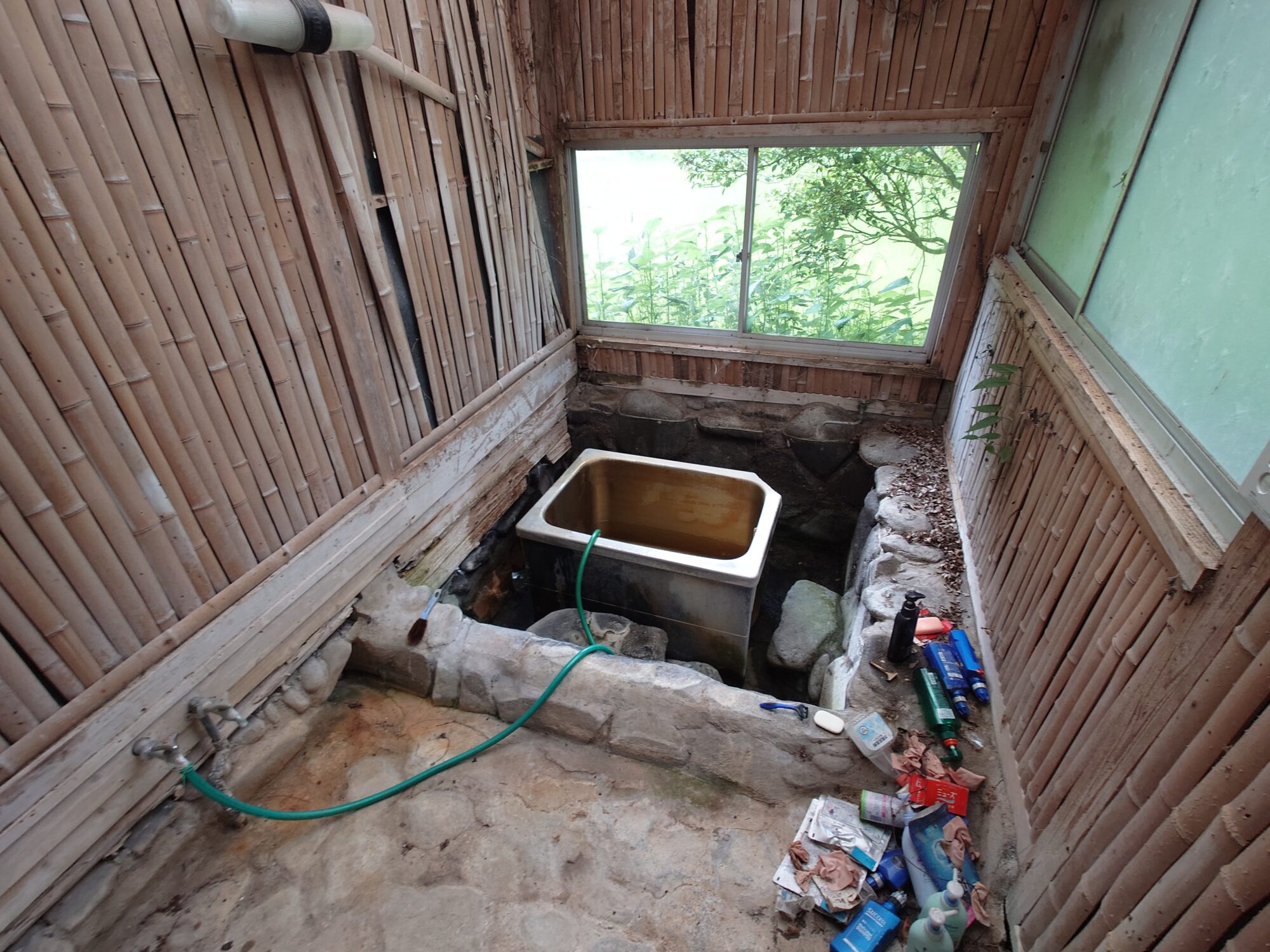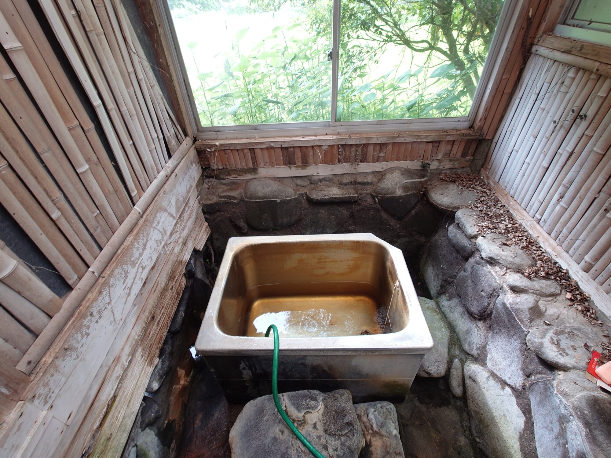 前回訪問時はちゃんと湯舟があって、そこにお湯が張られていたのですが、湯舟の中にステンレス湯舟が置かれていました。