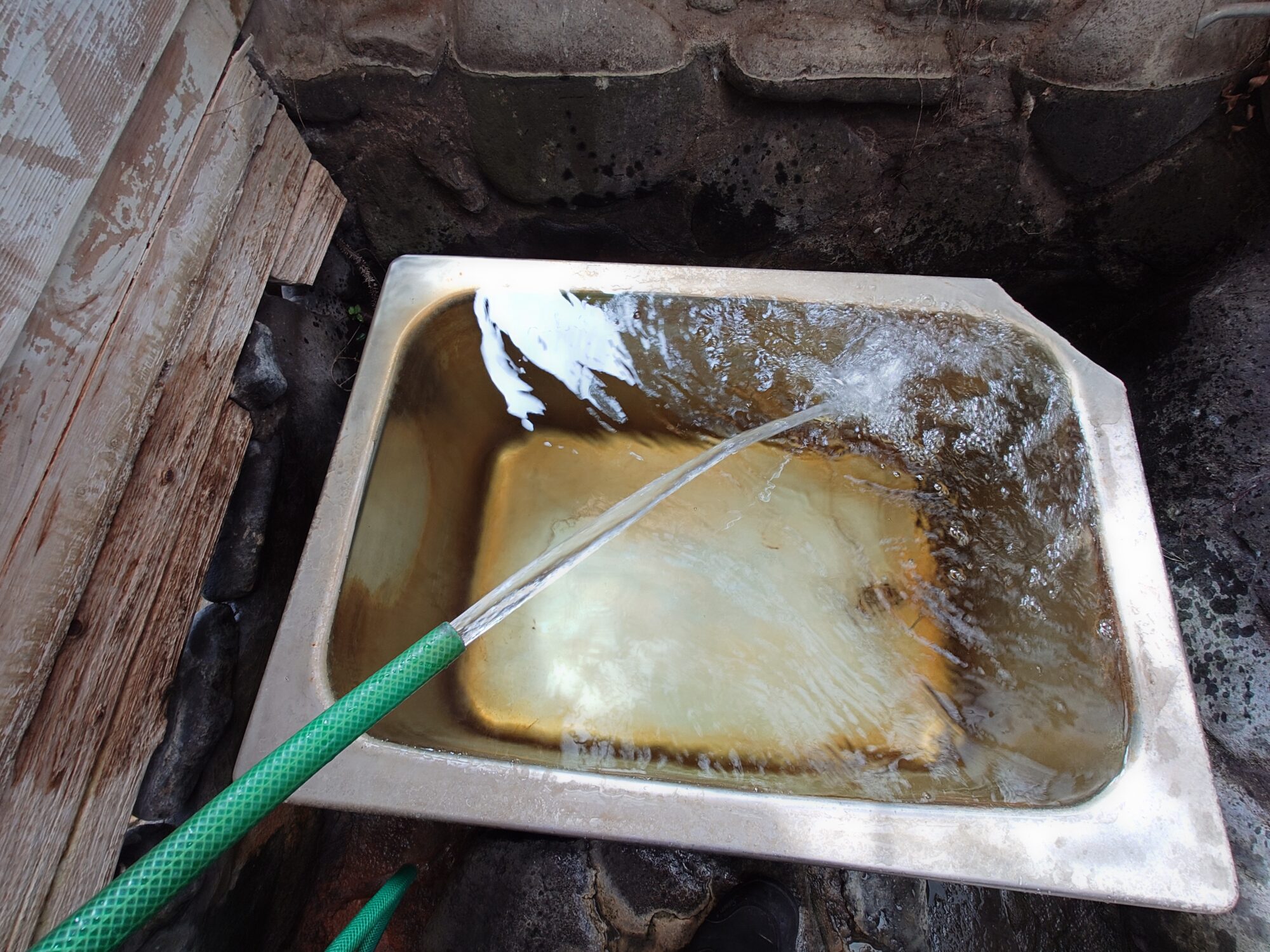 ステンレス湯舟はカラッポですが、お湯が常時出しっぱなしになっており、そこにホースを突っ込んで溜める形式です。