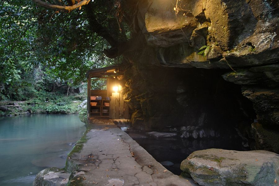 お宿で履物を借りて、すぐの所にあります。手前に女性用の岩風呂湯小屋があり、その奥が混浴。川沿いの素敵なロケーションにあり、洞窟と言う名前が相応しい造りをしていました。