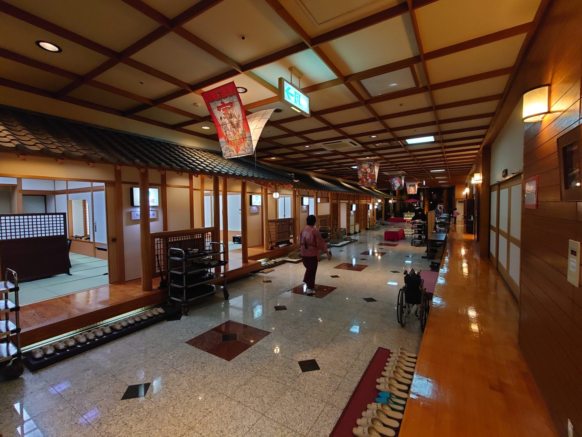 期待の庭園大浴場は、フロントから館内を歩いた先にあります。