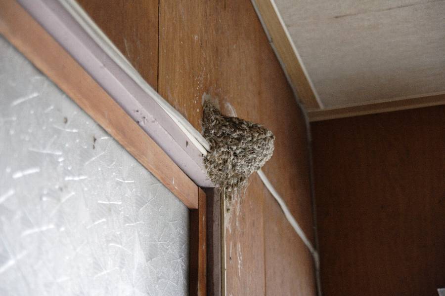 開けっ放しの玄関、燕の巣、そして、勝手に入ってくれ状態の貯金箱。