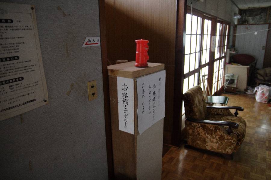 仕方がないので、誰かいないものかと、「こんにちわー!」なんて言いながら中に入っていくと、お風呂場手前に郵便ポストの貯金箱が置かれており、「お湯銭は上のポストに」と書かれていました。