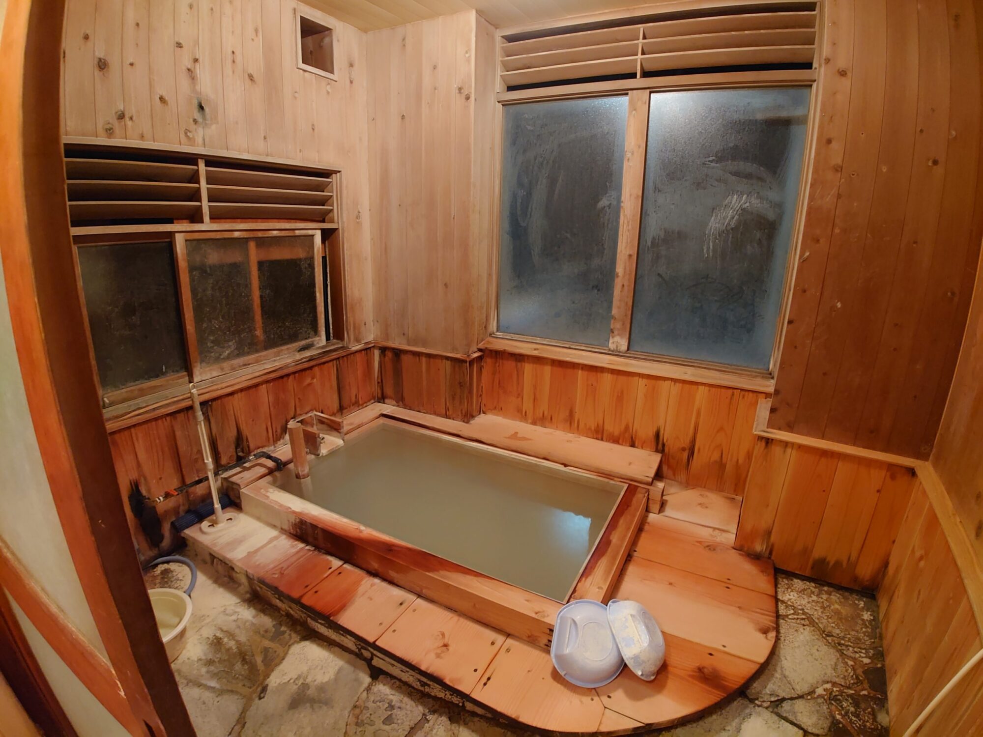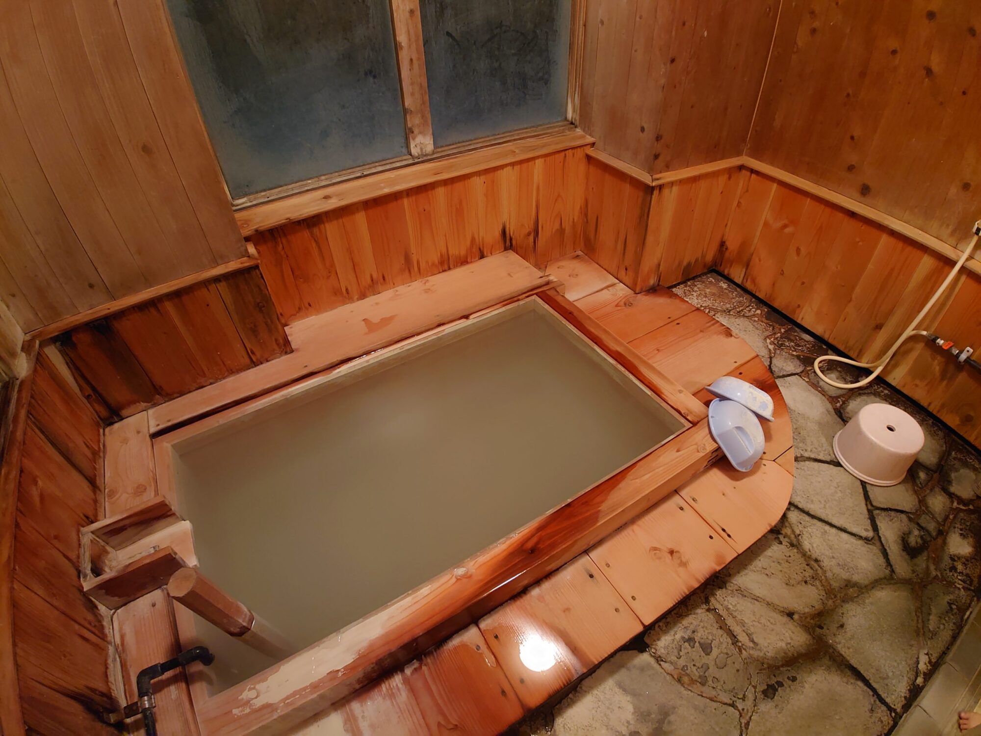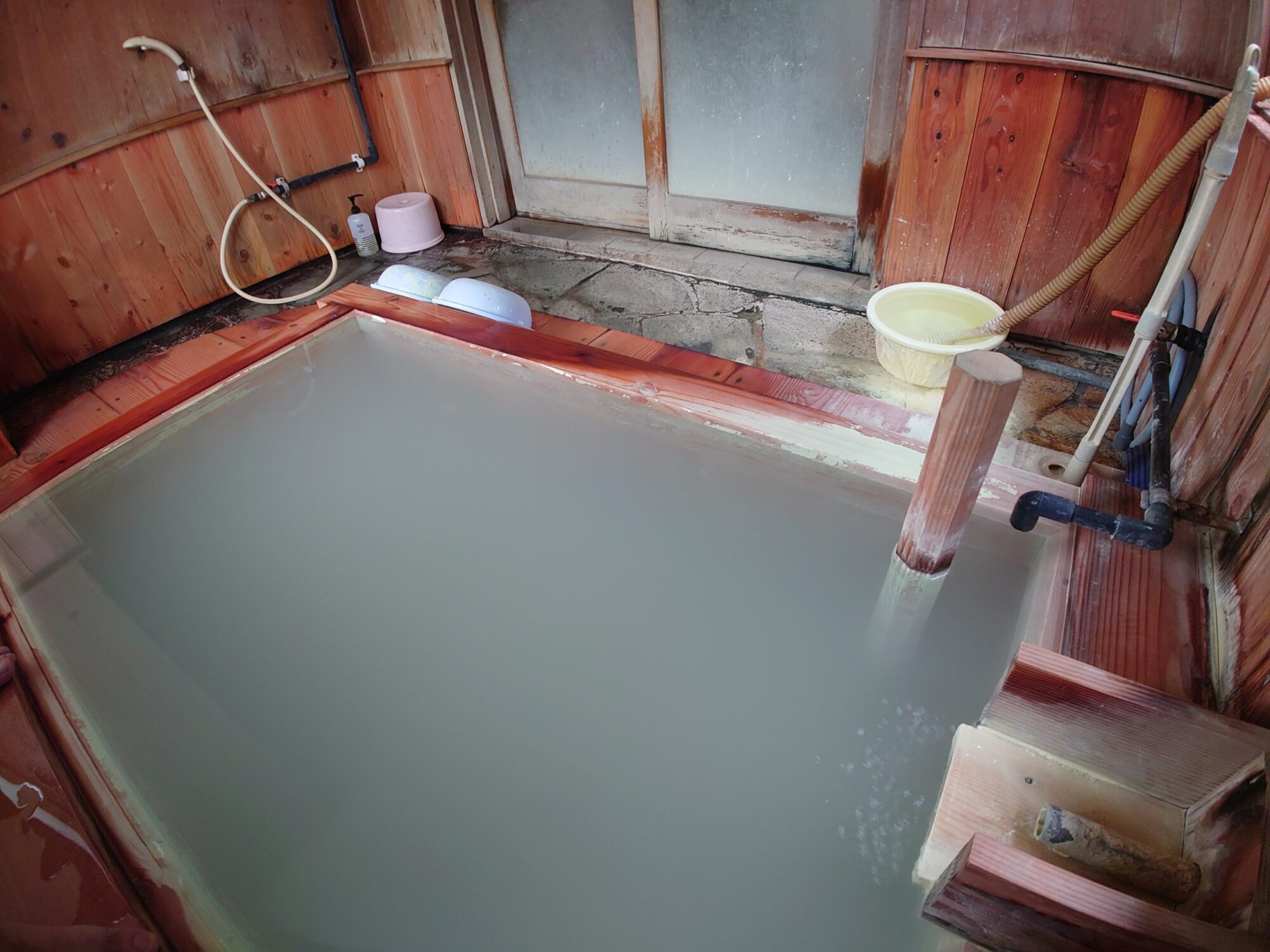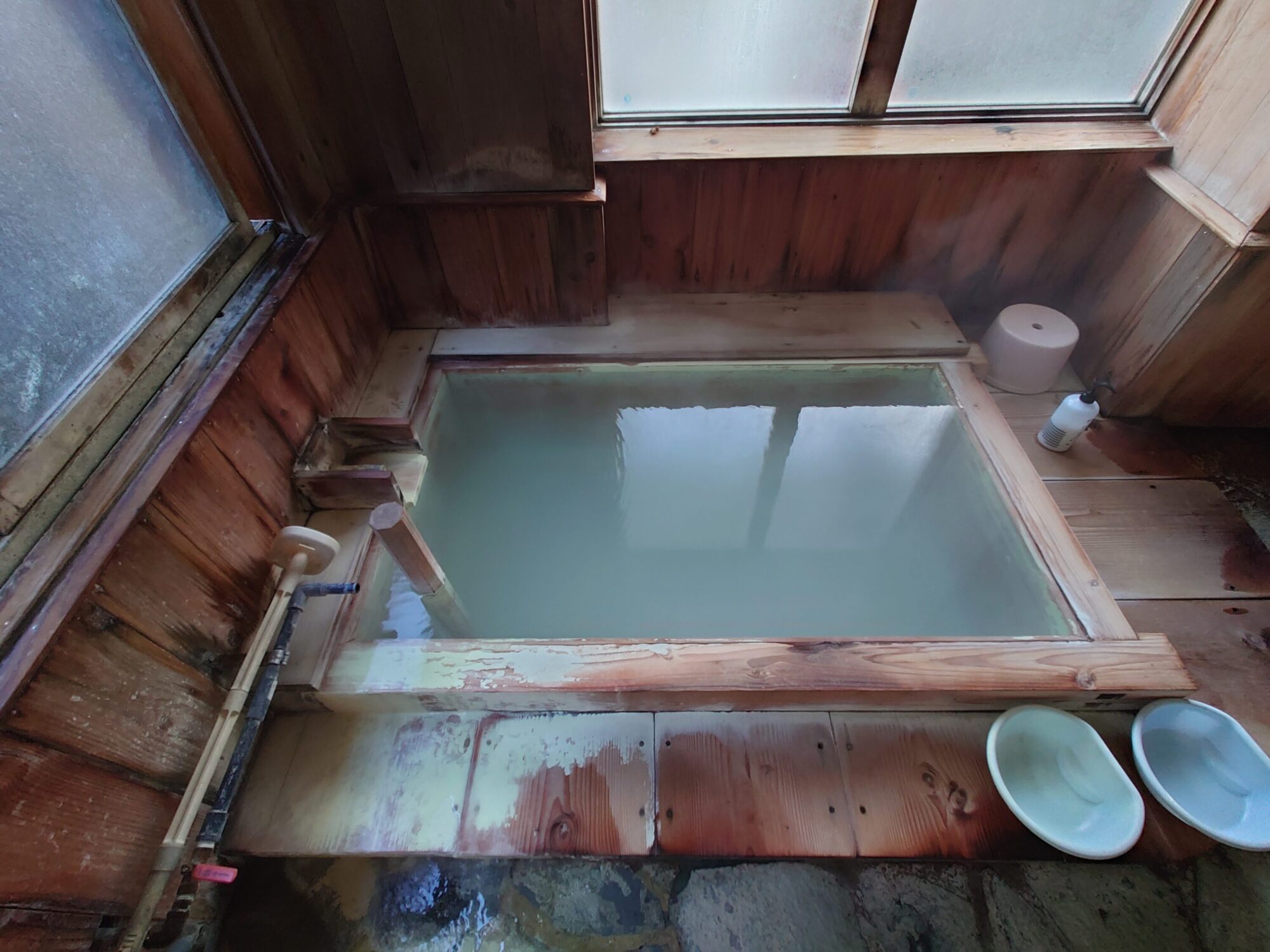 素手で触るには少し熱いくらいの温度で、桶に注がれたお湯はそのまま洗い場に流れ去り捨てられています。きっと、供給されている全量を湯舟に投入すると熱くなりすぎるので、捨ててしまっているのでしょうね。