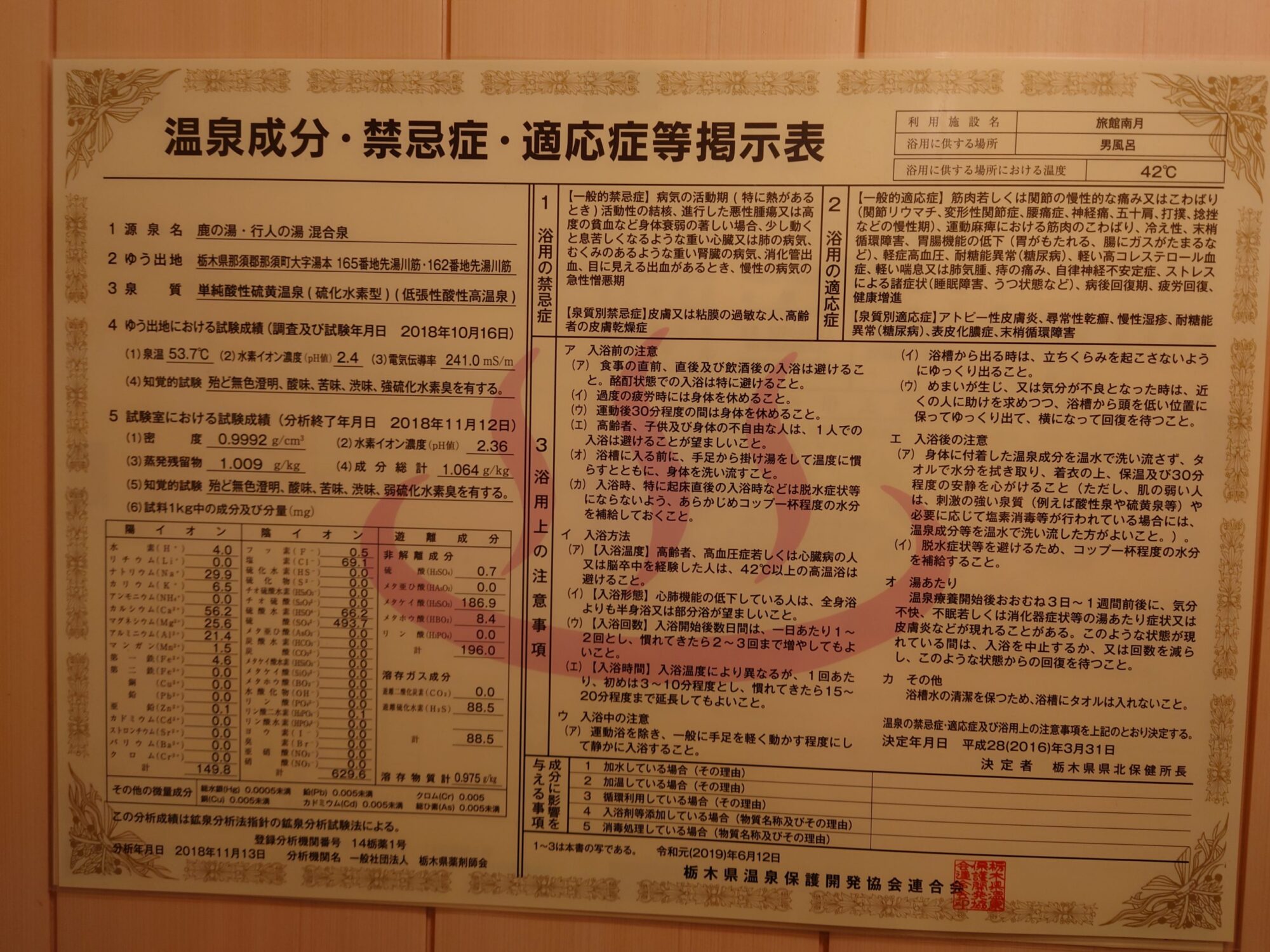 鹿の湯+行人の湯混合泉は入る度に泉温が違ったり、濃く感じたり薄く感じたりする日もあるので、絶好調の時の分析なのかも知れません。