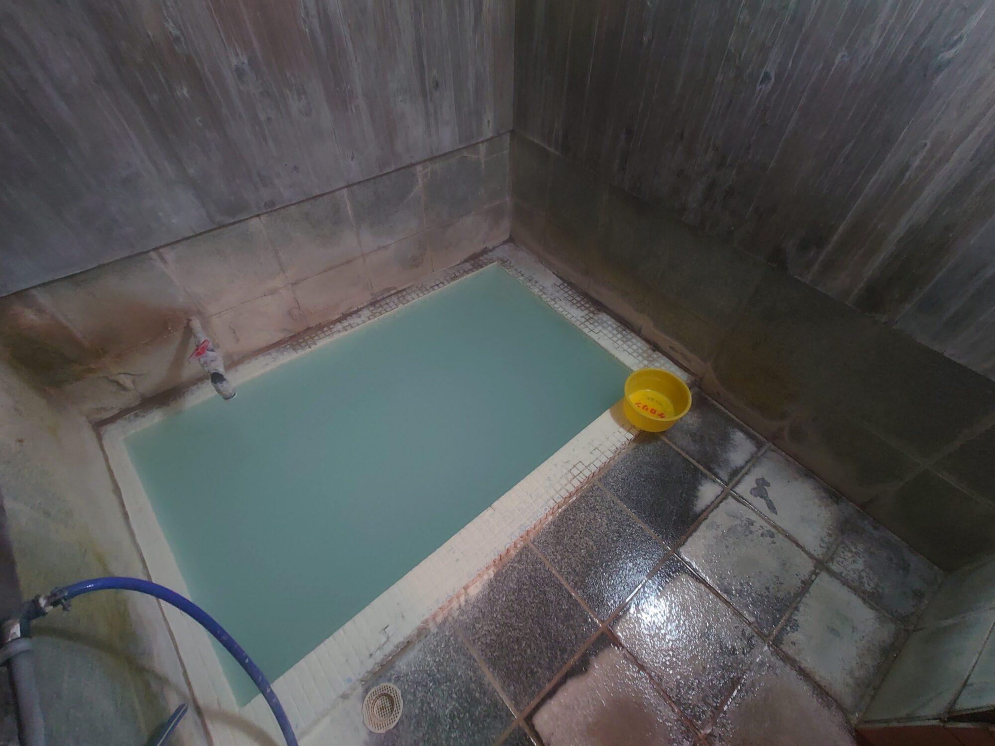 湯口からは熱い源泉が静かに注がれているのですが、その隣にはもう一本ホースがあって、桶に源泉が注がれていました。