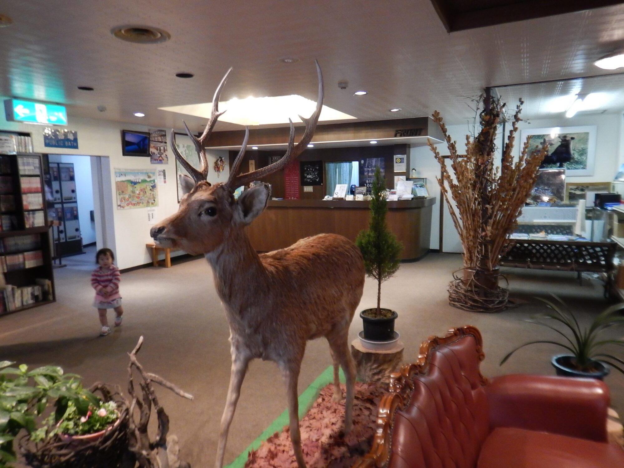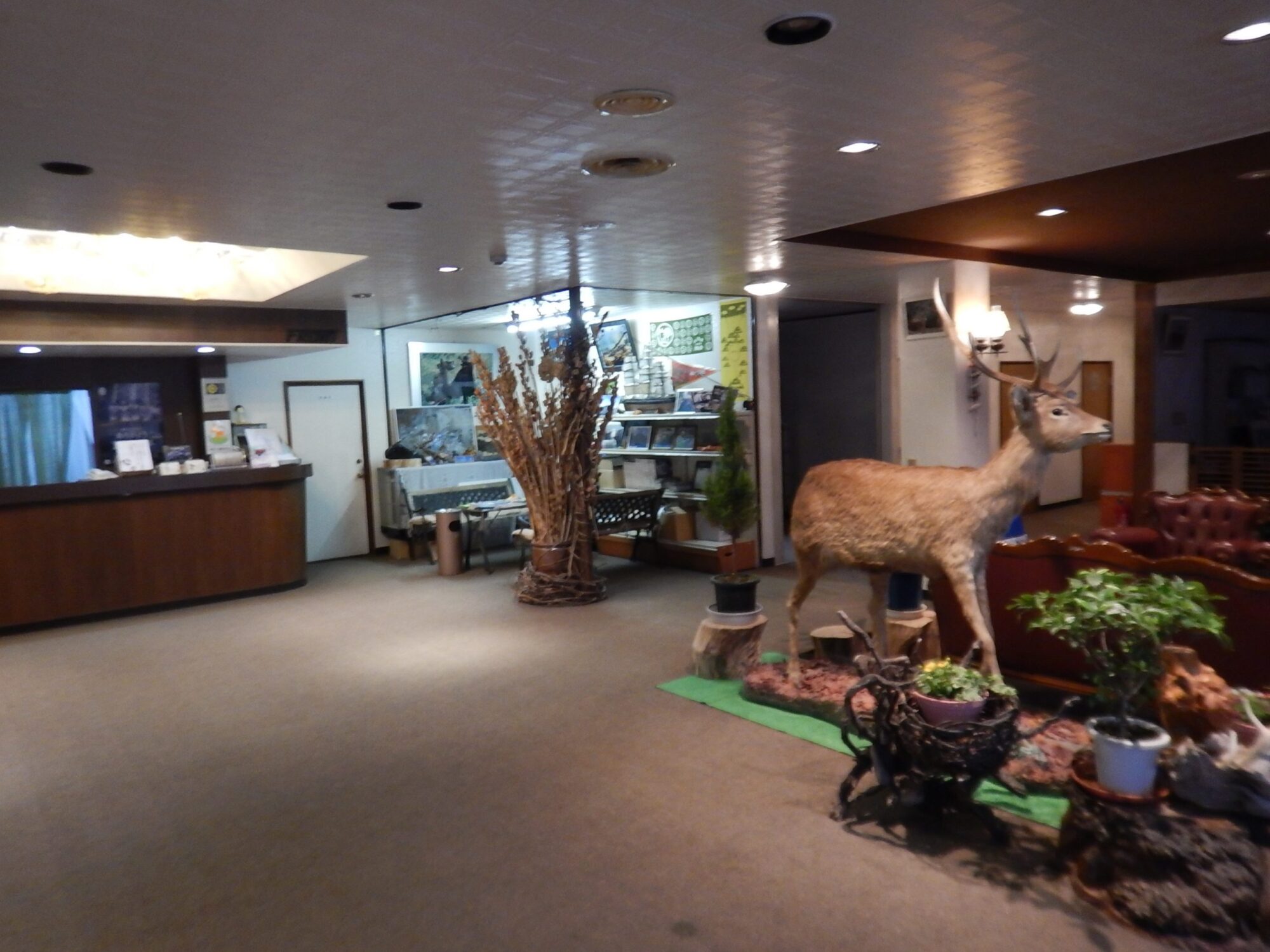 ホテルのフロントで鹿のはく製がお出迎えしてくれました。