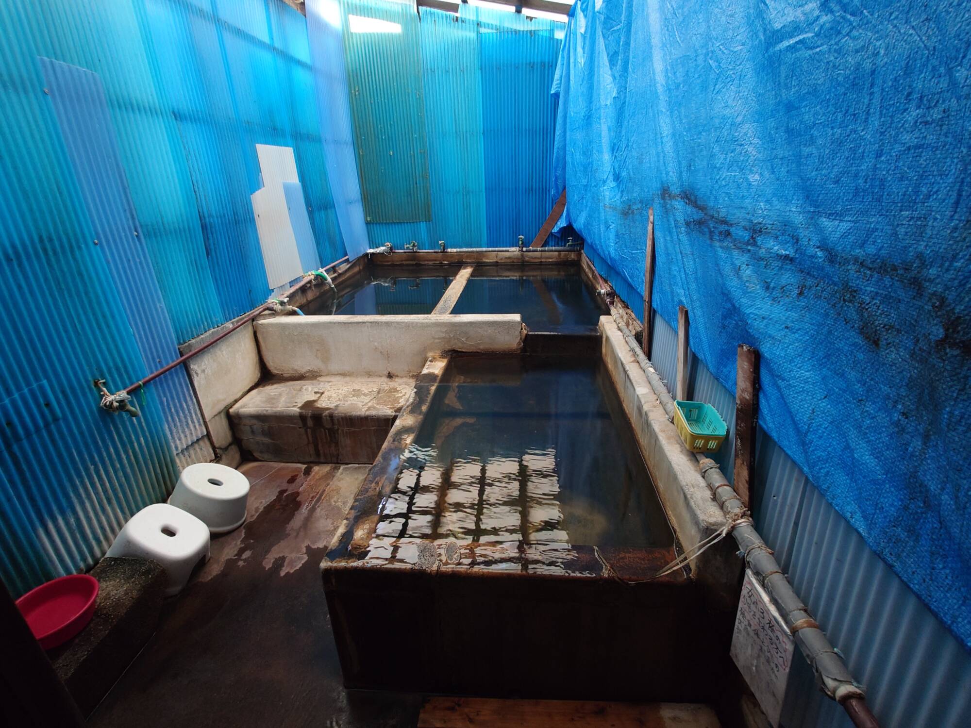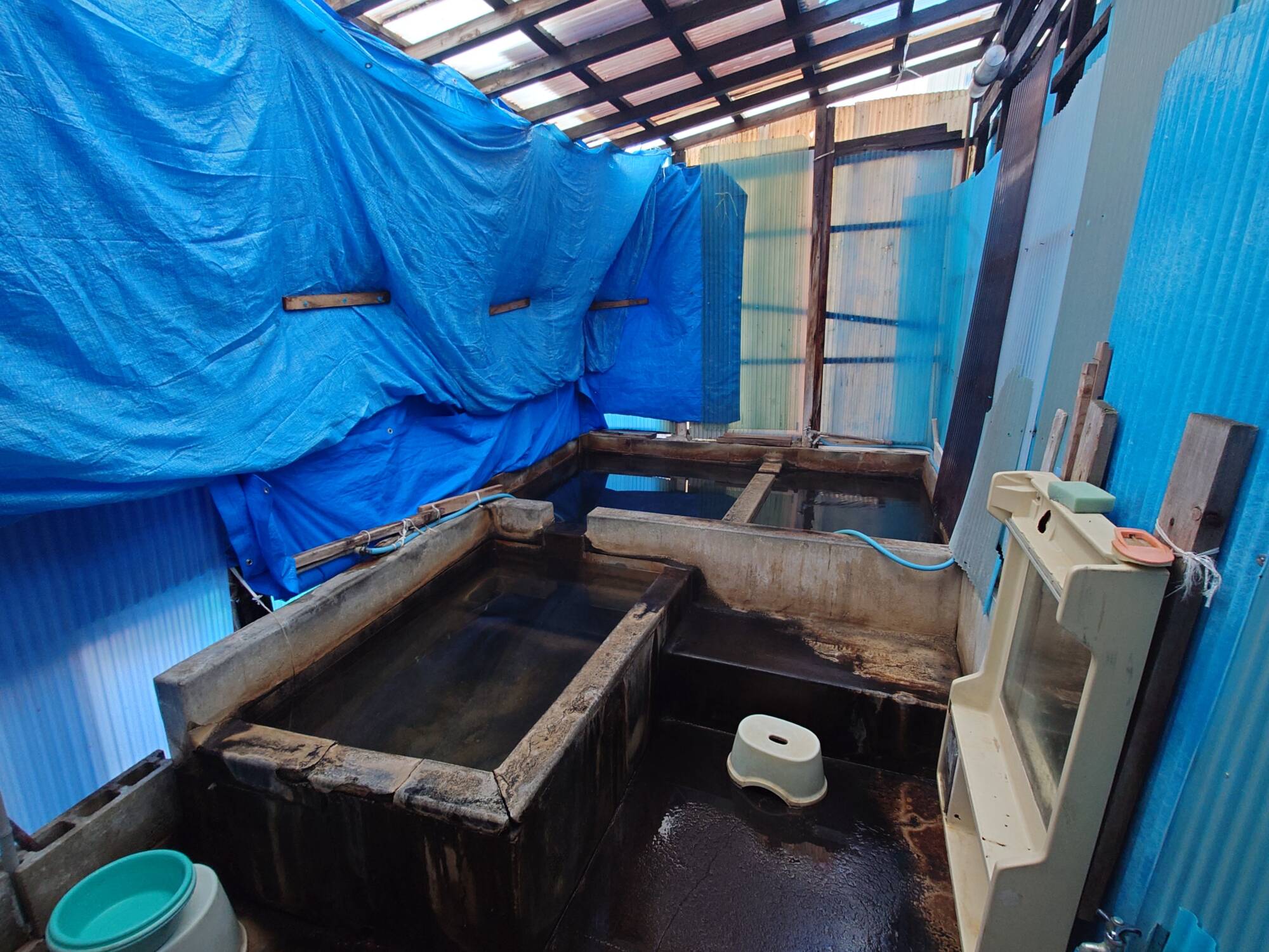 湯小屋の雰囲気が少し変わっていて、一部が青いシートで覆われていました。