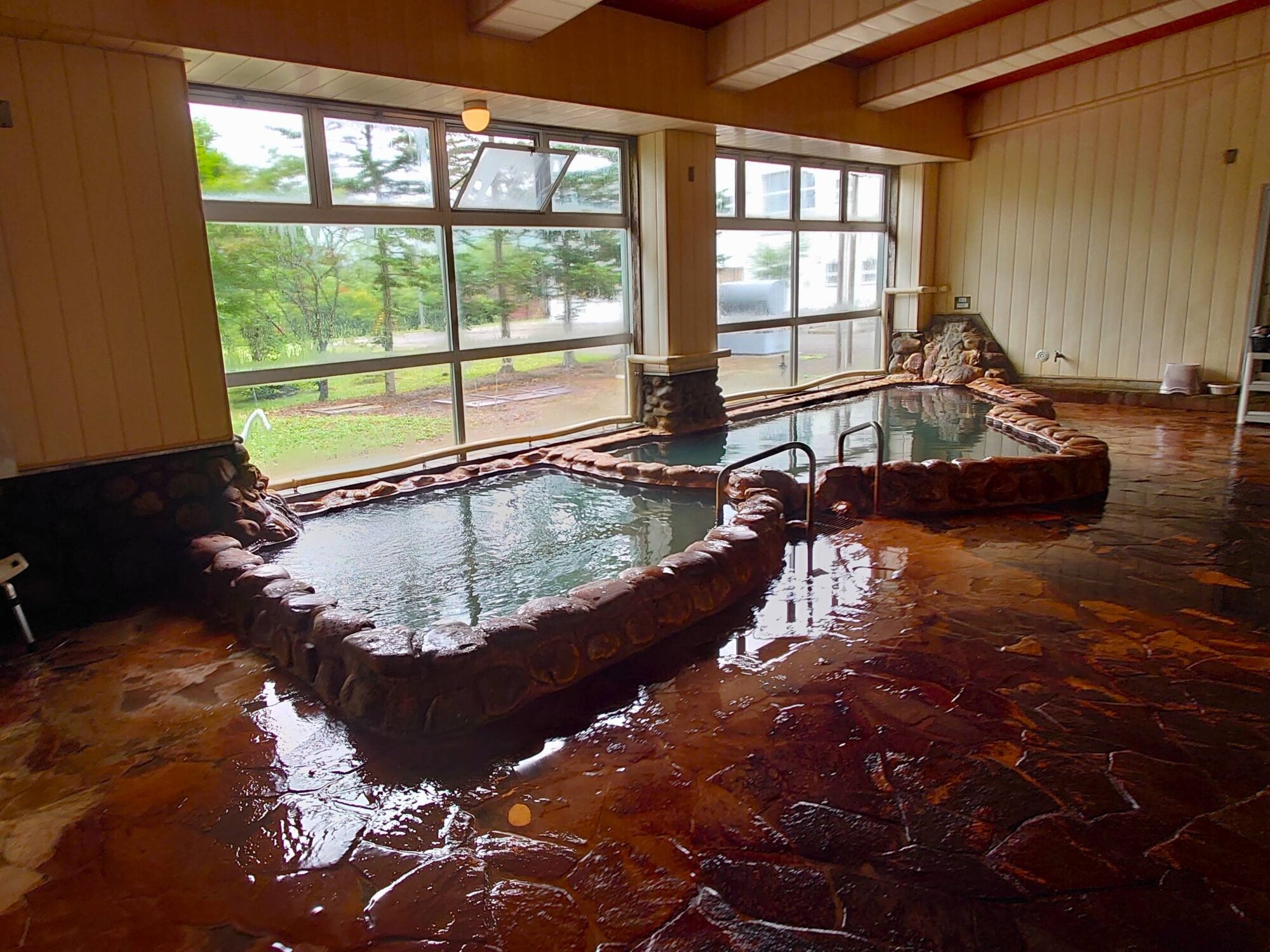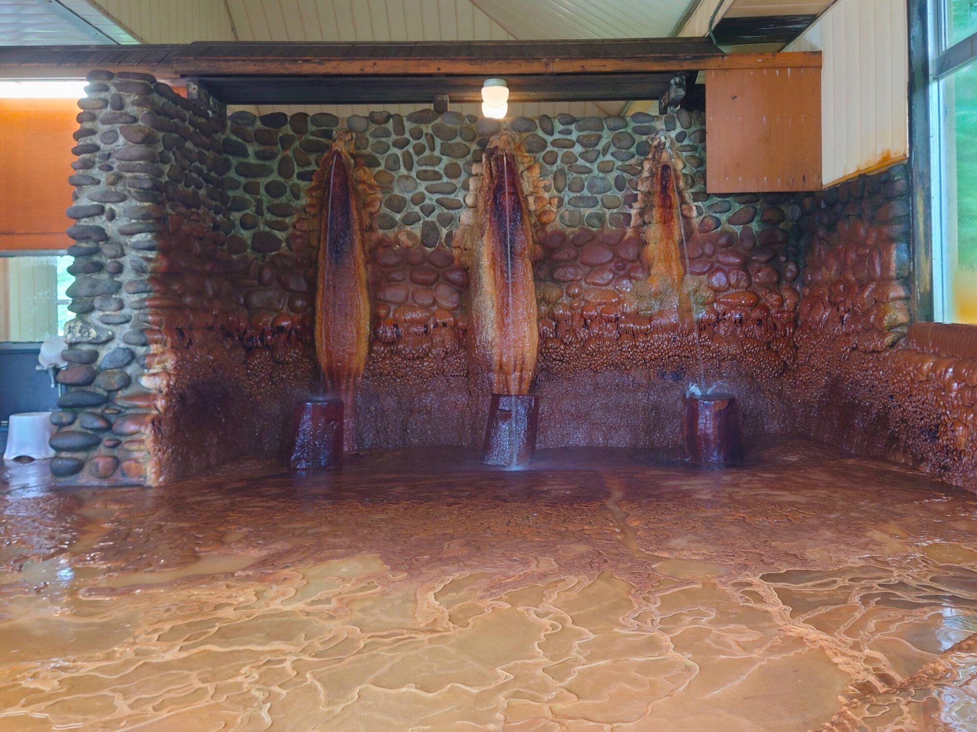 まず最初に目に飛び込んできたのは、温泉成分によって赤茶色に変色した床と、2槽ある岩風呂です。