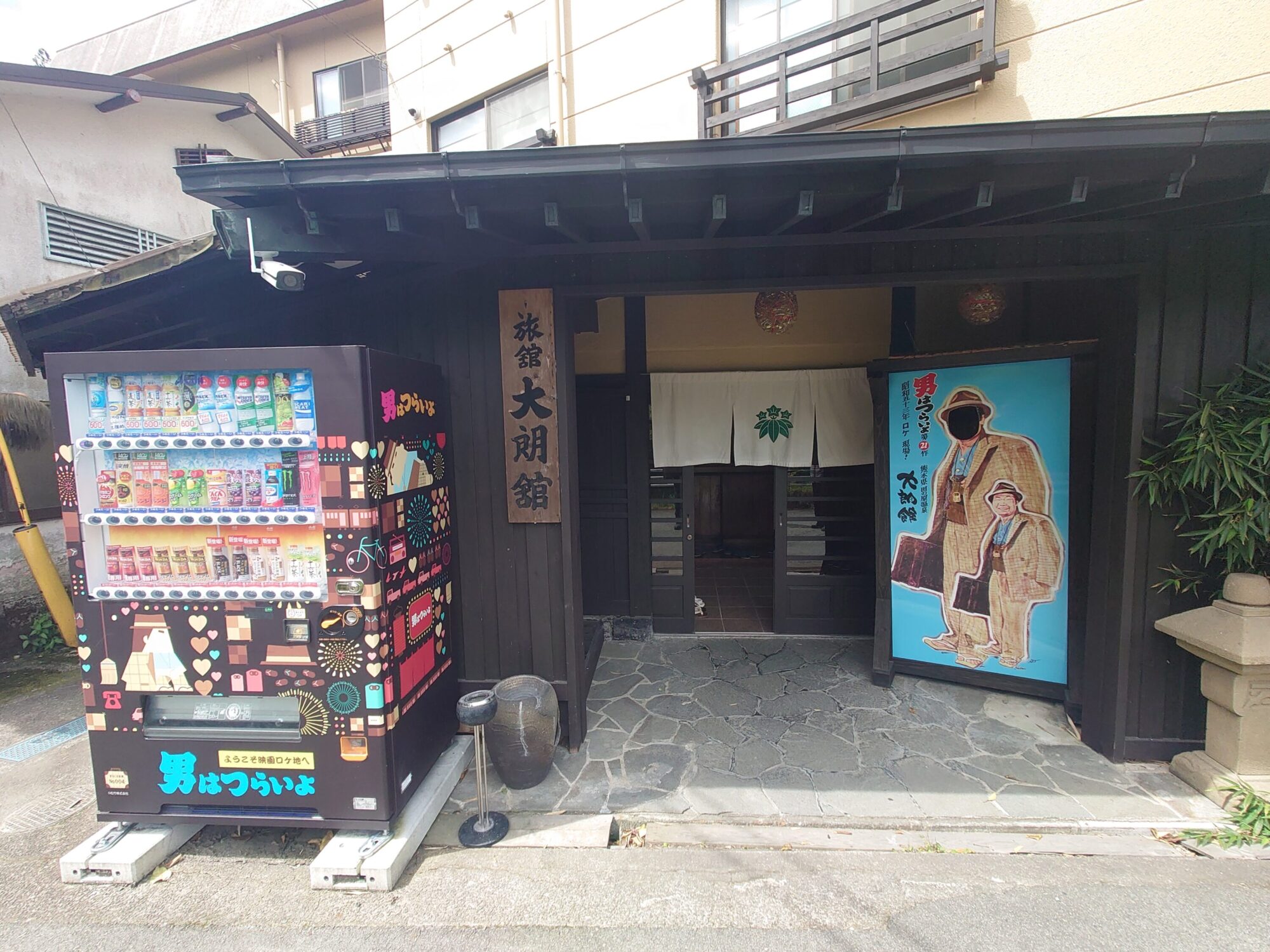 玄関先には何故か「男はつらいよ」と書かれた自販機と、渥美清が演じた寅さんの顔抜きがあります。