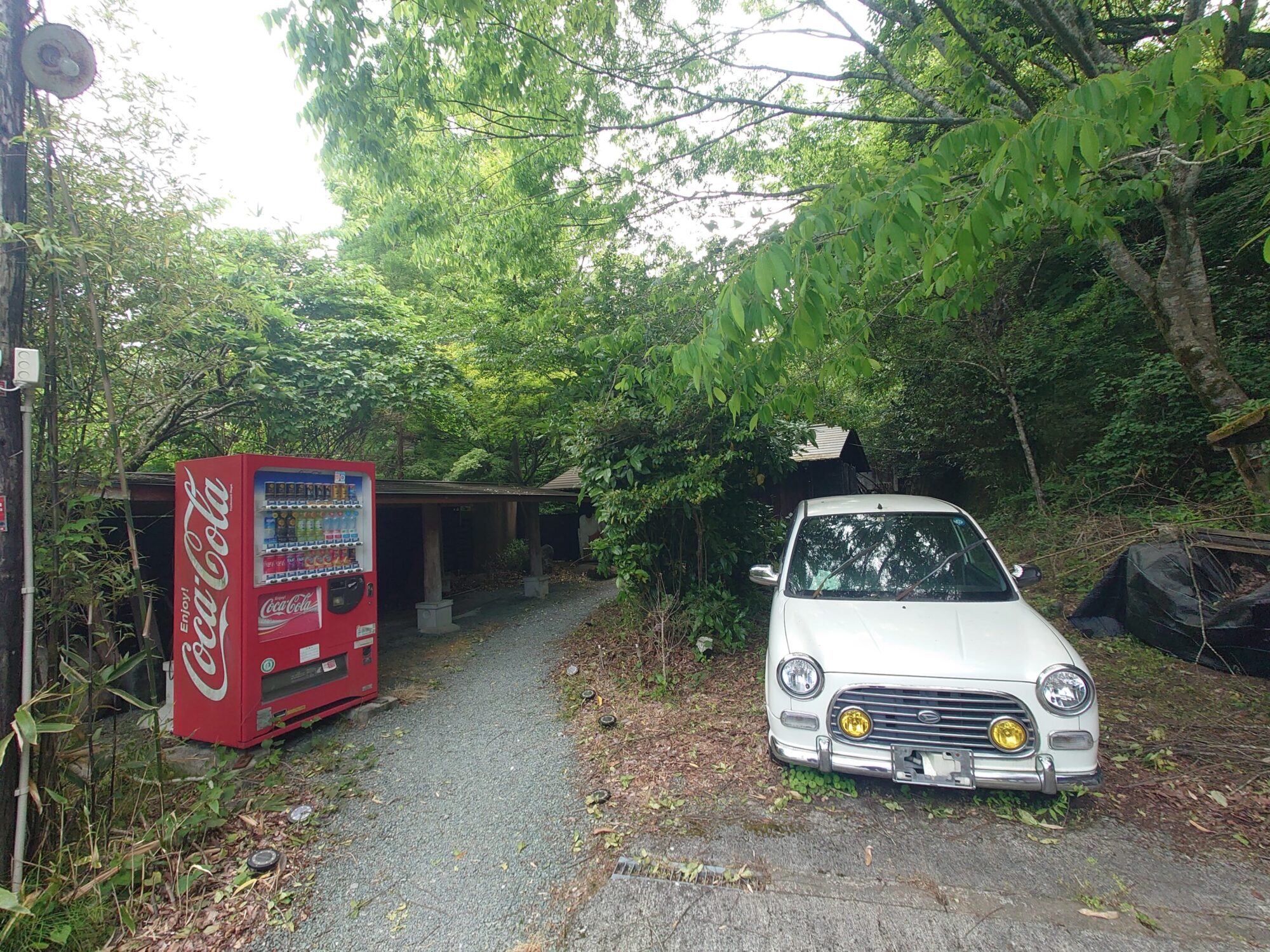 離れにある貸切風呂の前にはナンバープレートも外れ朽ち果てつつある車が置かれていました。