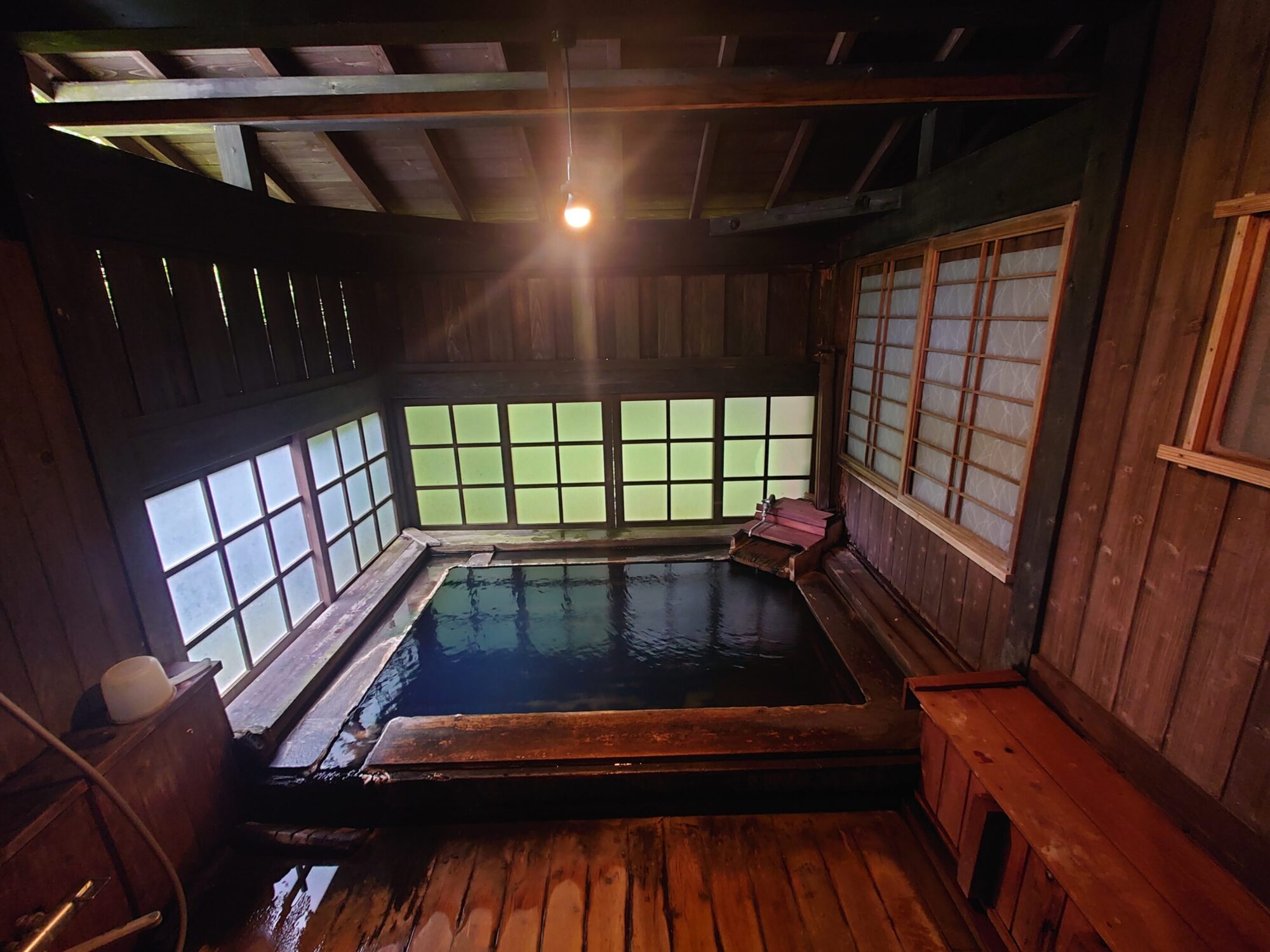 露天風呂程ではありませんけど、この檜風呂にも外光が差し込むため、ごく僅かですが青く輝いて見えます。