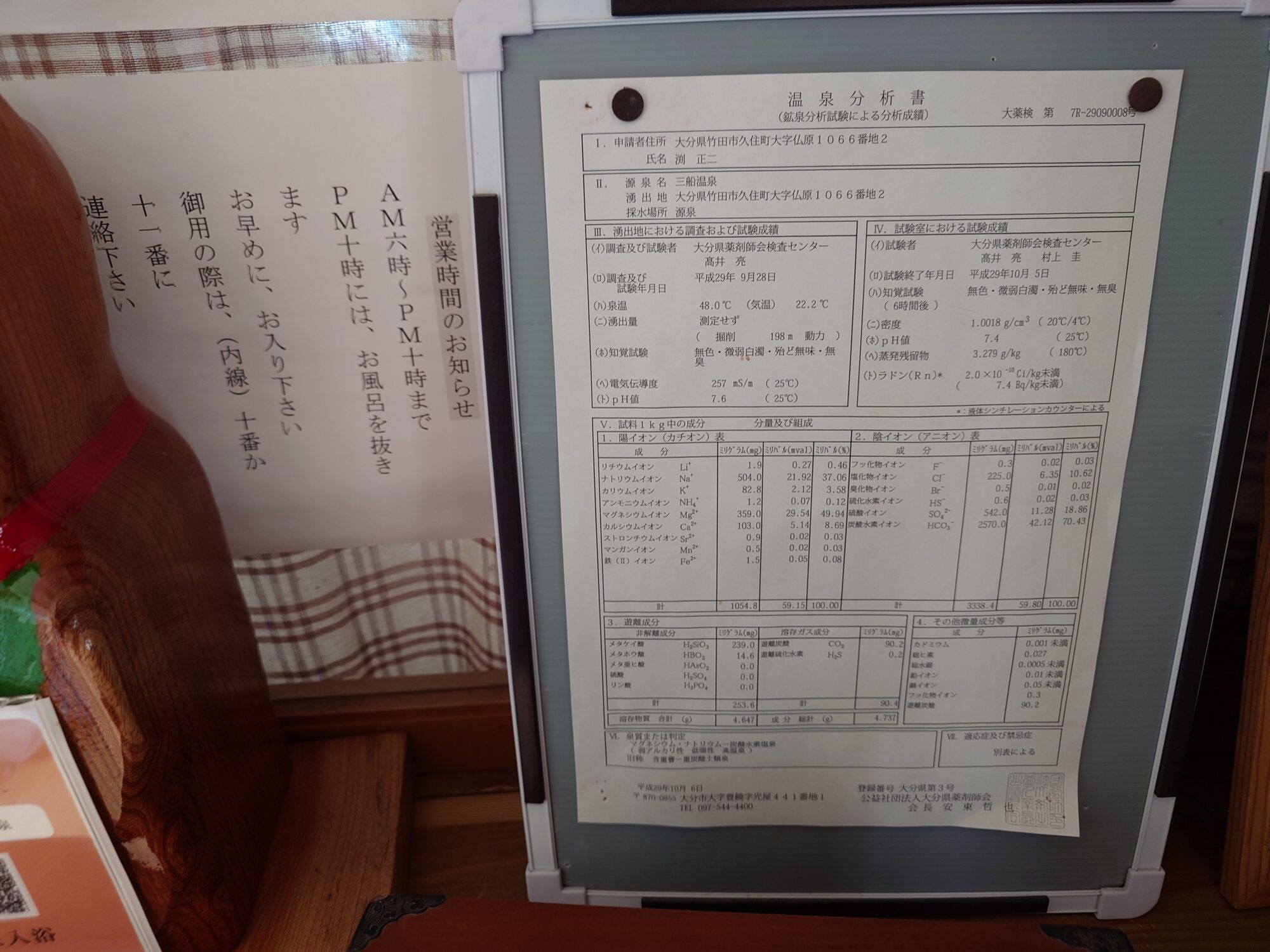 入口には成分表も掲示されていて、その隣に営業時間の案内、朝は6時からと書かれていました。