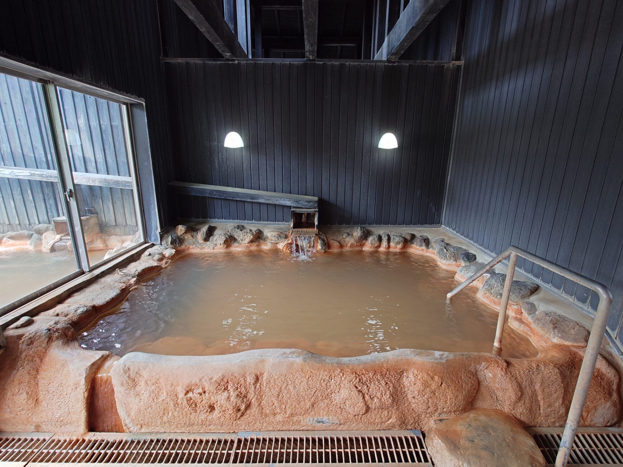 内湯の温度はほぼ適温、フレッシュな金気臭がして、お湯の中ではキシキシ、お湯から上がると少しペタペタする印象の肌触り。