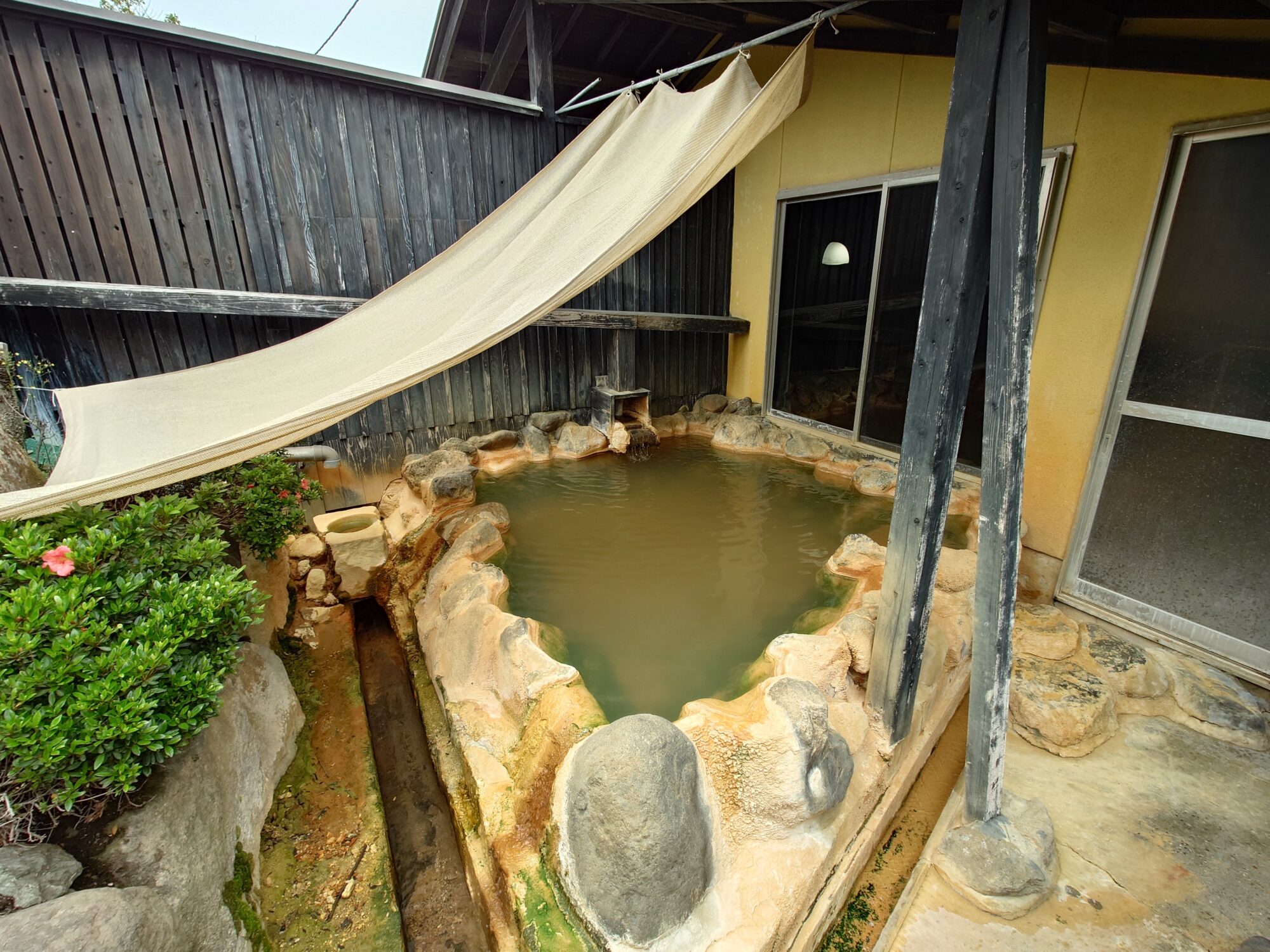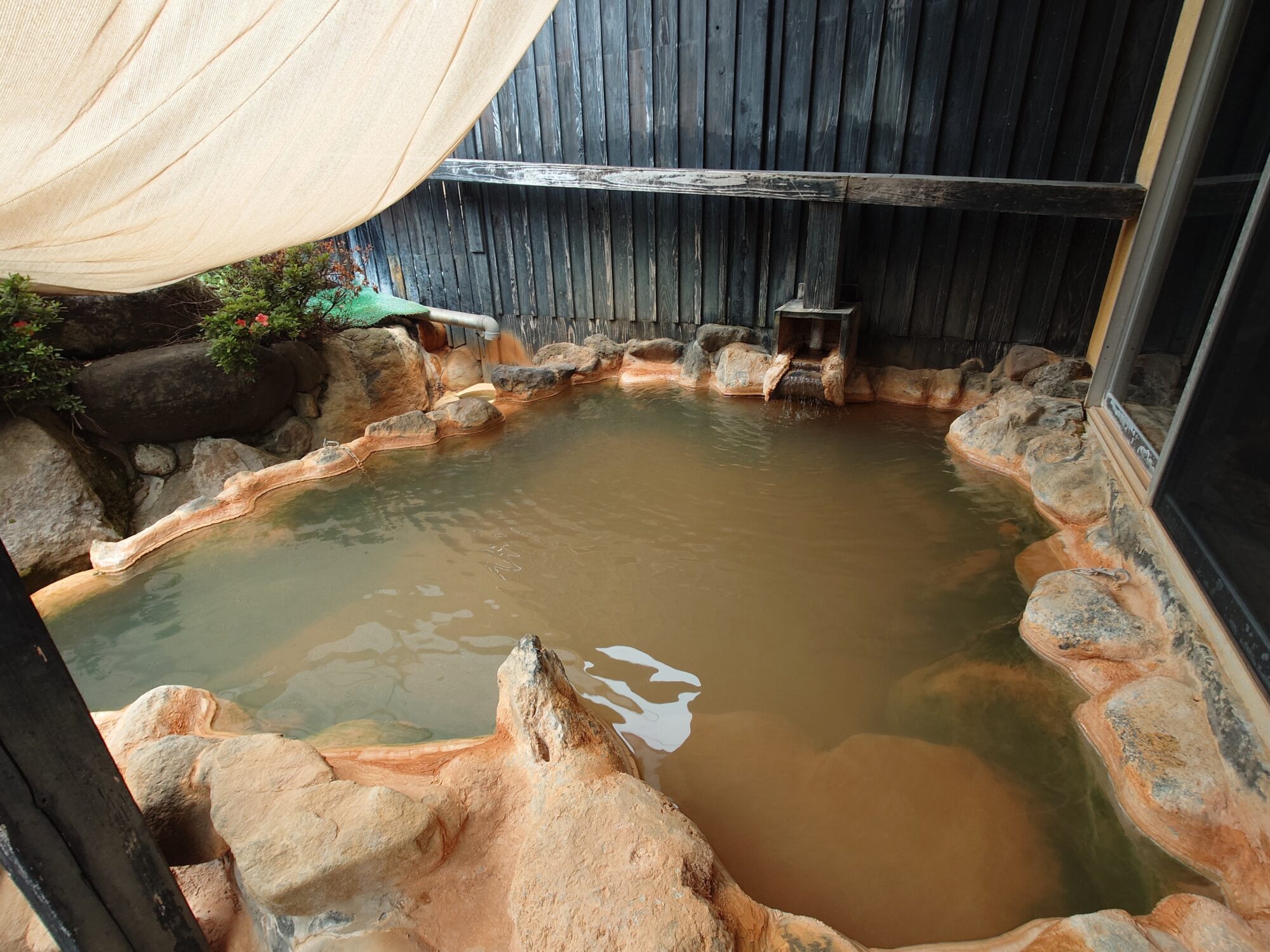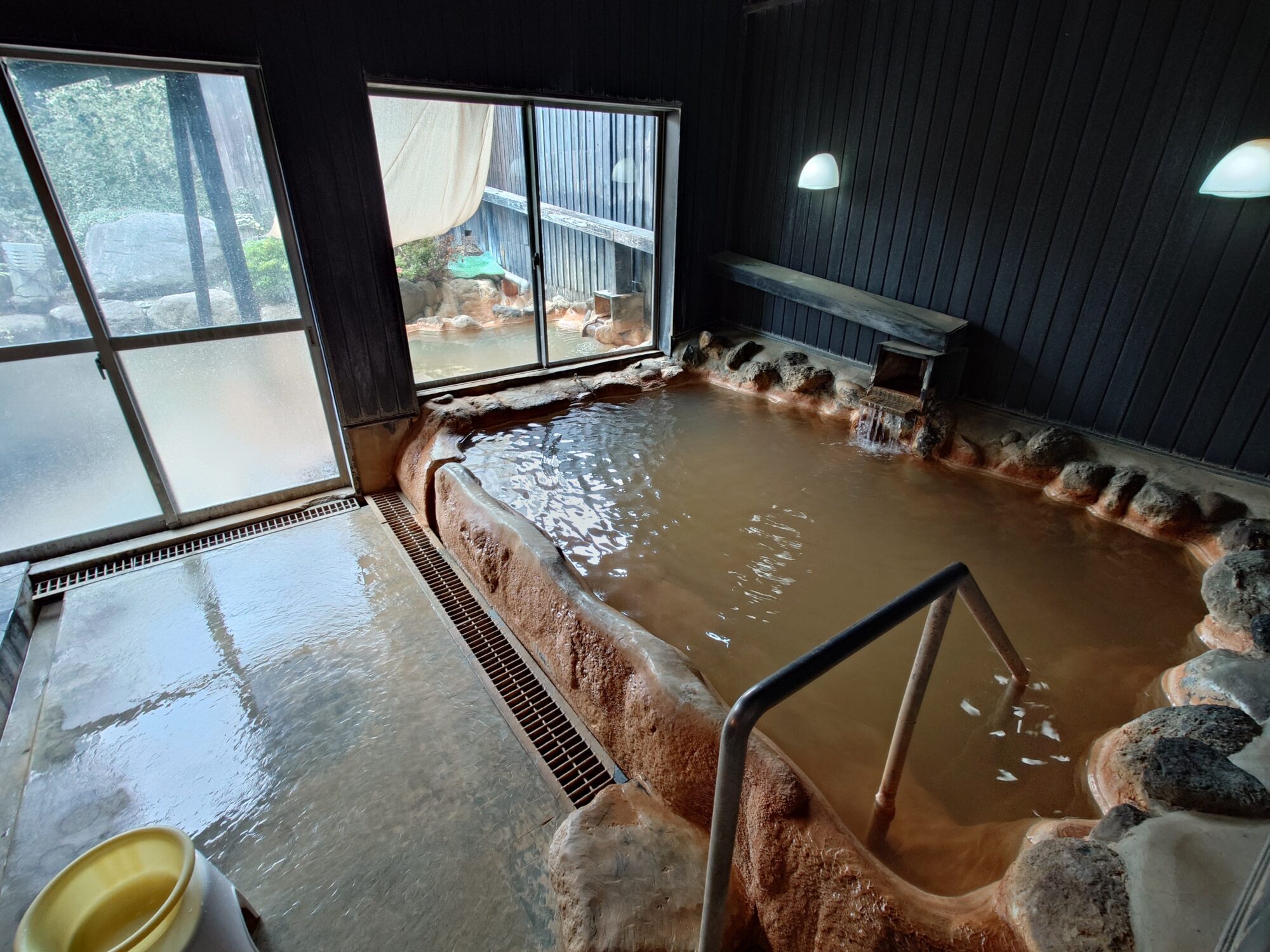 お湯は湯底がギリギリ透けて見える?見えない?程度で、黄土色に濁っています。