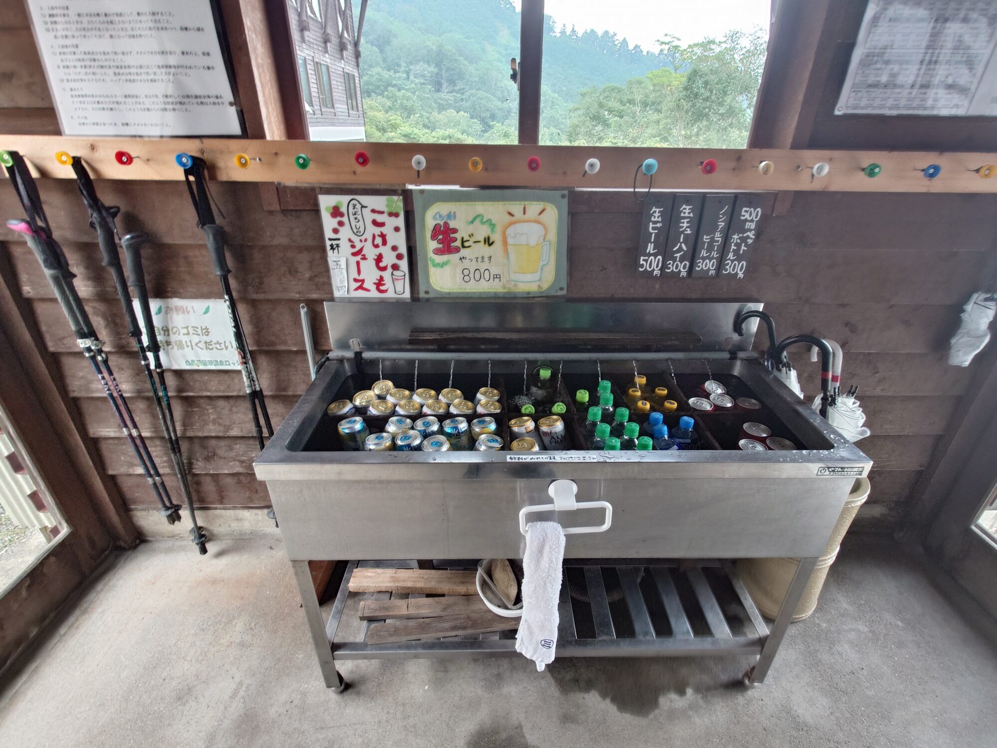 500mlのペットボトルが300円、高いですけど、人里から遠く離れた山奥って考えたらこんなモンかな?