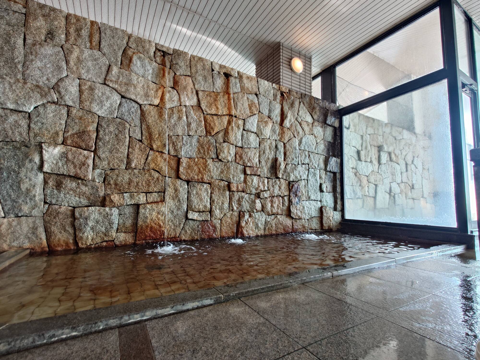 内湯は右手前が洗い場、左手前が打たせ湯で、奥に広々と温泉浴槽があります。