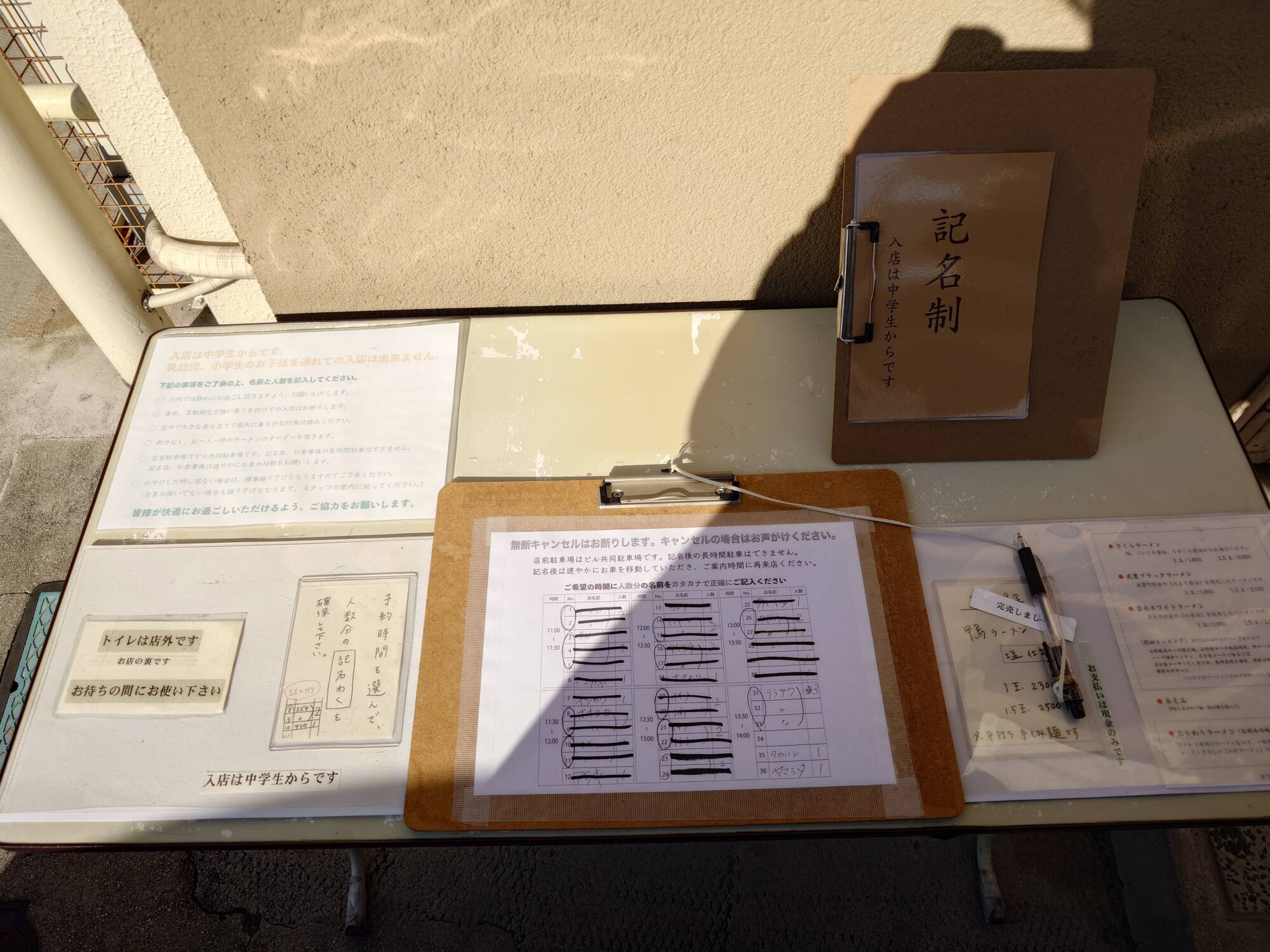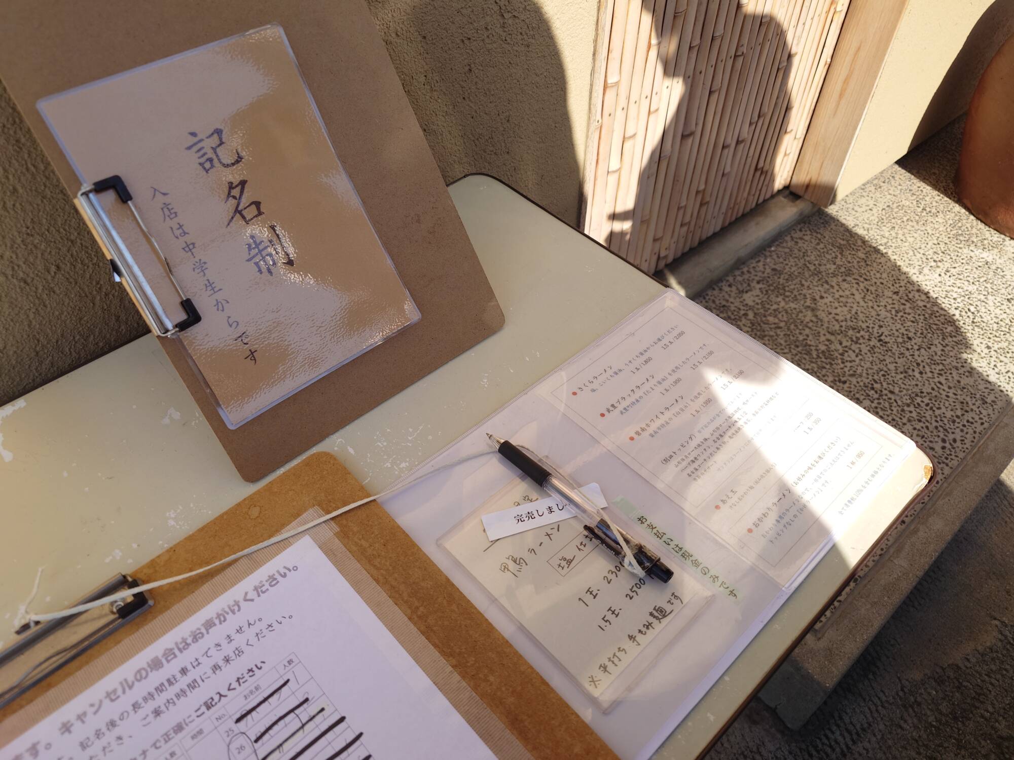 暖簾の下には注意書きと記名帳があり、そこに名前を書いて、時間が来たら案内されます。