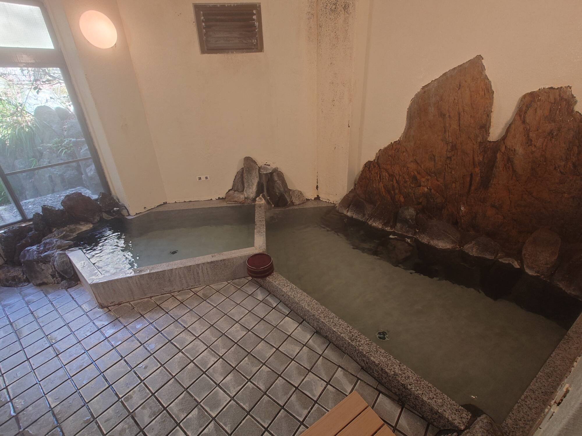 でも湯使いはちょっと違っていて、向かって右側が加温浴槽、左側が非加熱の源泉浴槽になっています。