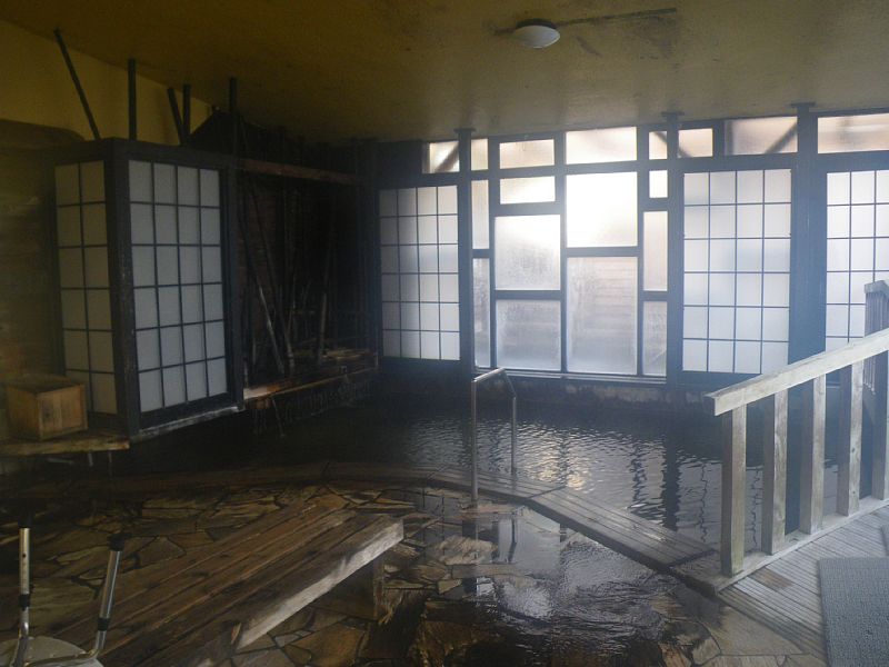 まずは内湯。手前に洗い場があり、奥に湯船。右側に露天へ通じる橋が