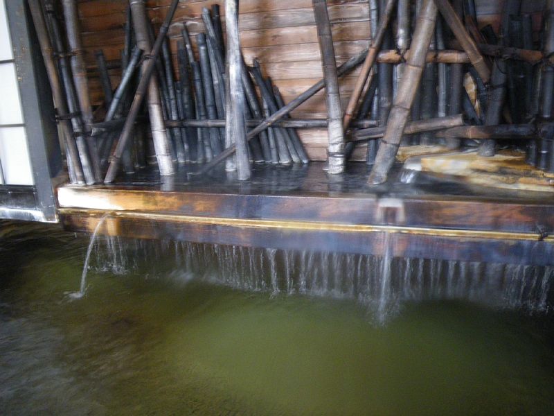 湯船に張られたお湯は、無色透明。竹が組まれた湯口からお湯が注がれ